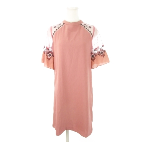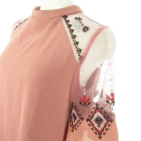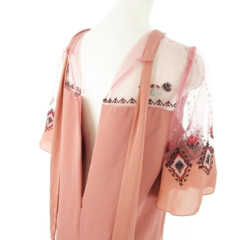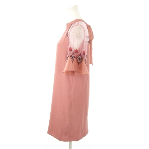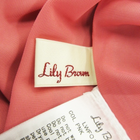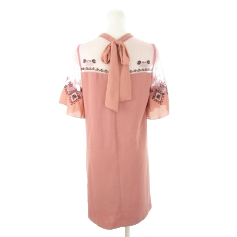 リリーブラウン Lily Brown ワンピース ミニ ハイネック 五分袖 フレアスリーブ リボン チュール シフォン 刺繍 花柄 F ピンク