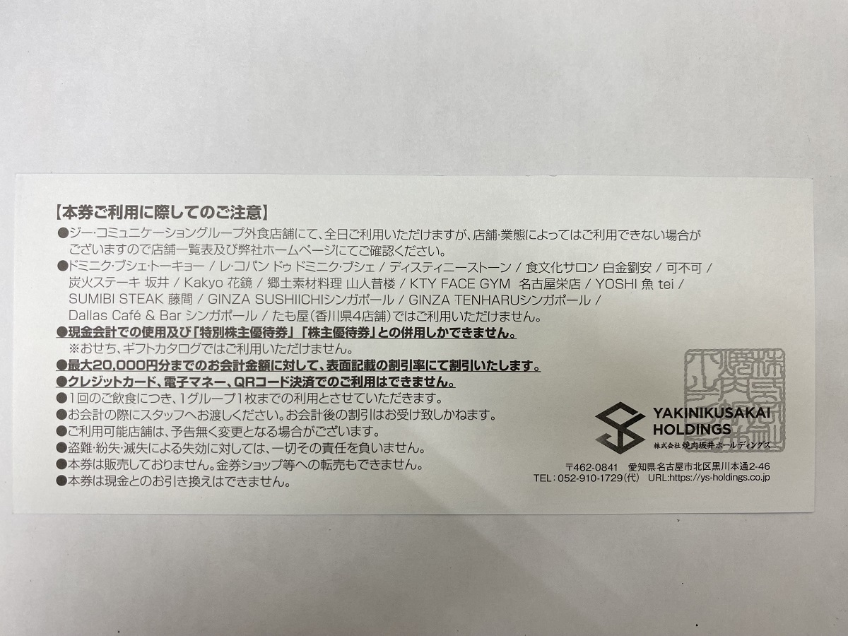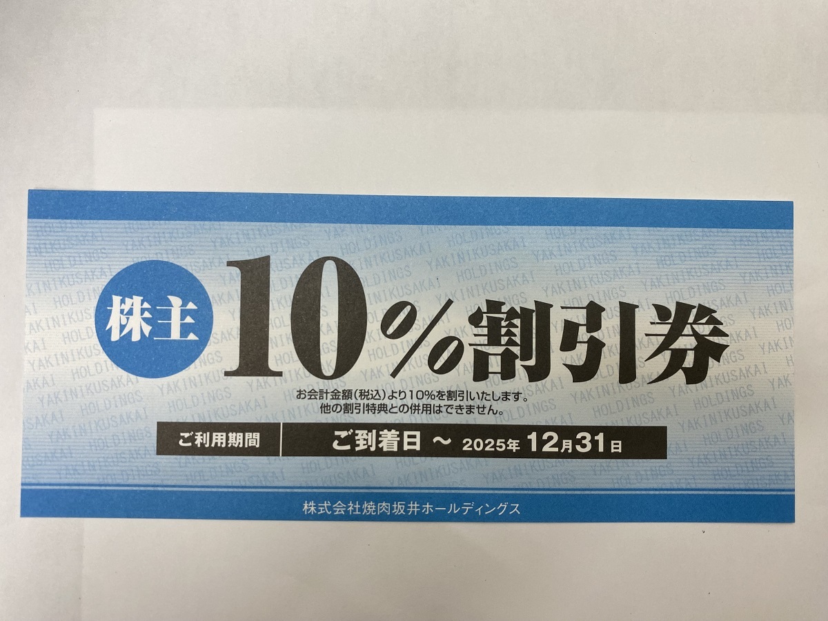 | 商品説明 | 【商品】 焼肉坂井ホールディングス 株主優待券 10%割引券 【有効期限】 2025年12月31日迄 【その他】 数量1で1枚分の価格になります。 |