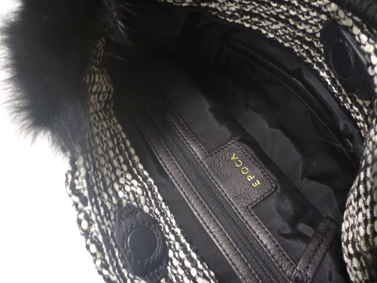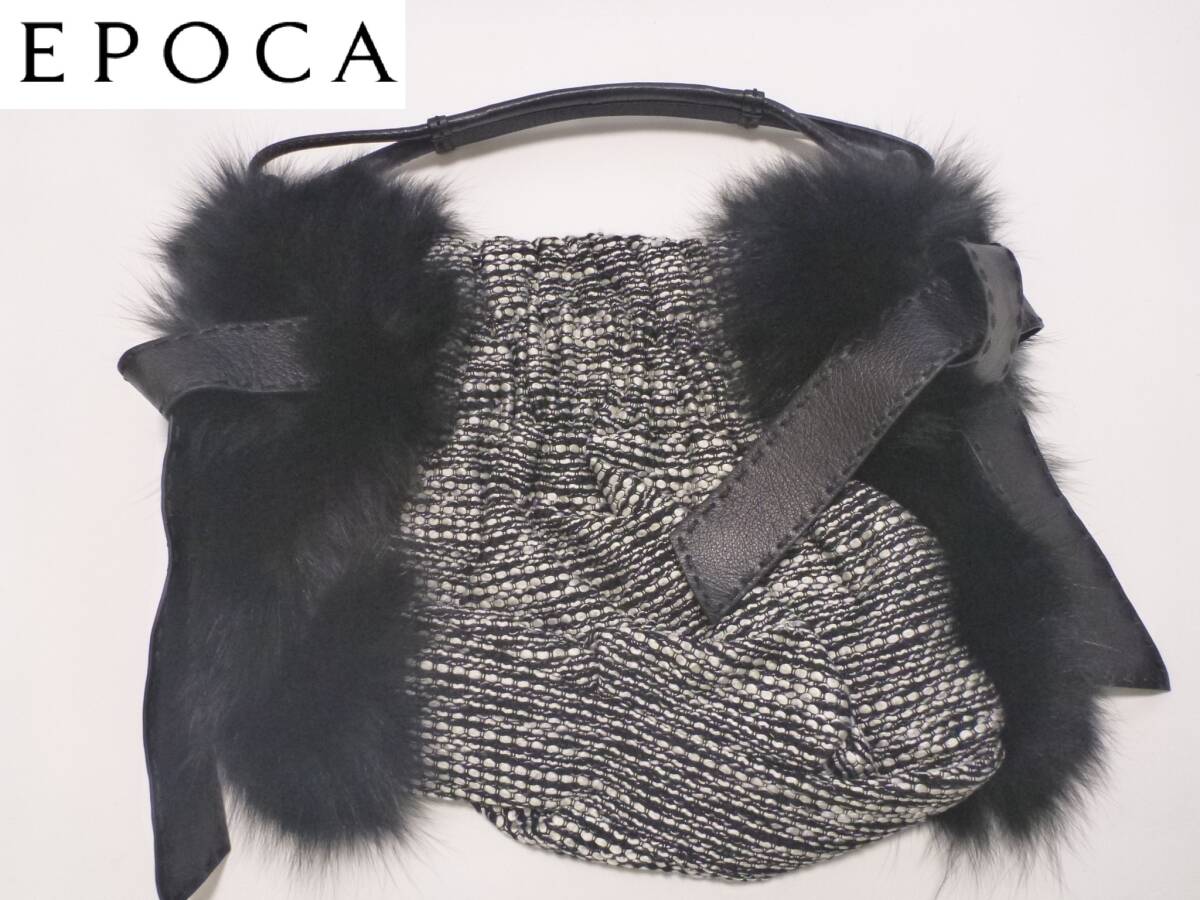 5万 超美品 EPOCA エポカ ★黒白ツイード 本革 ラビットファー リボン ショルダーバッグ ハンドバッグ ロゴプレート