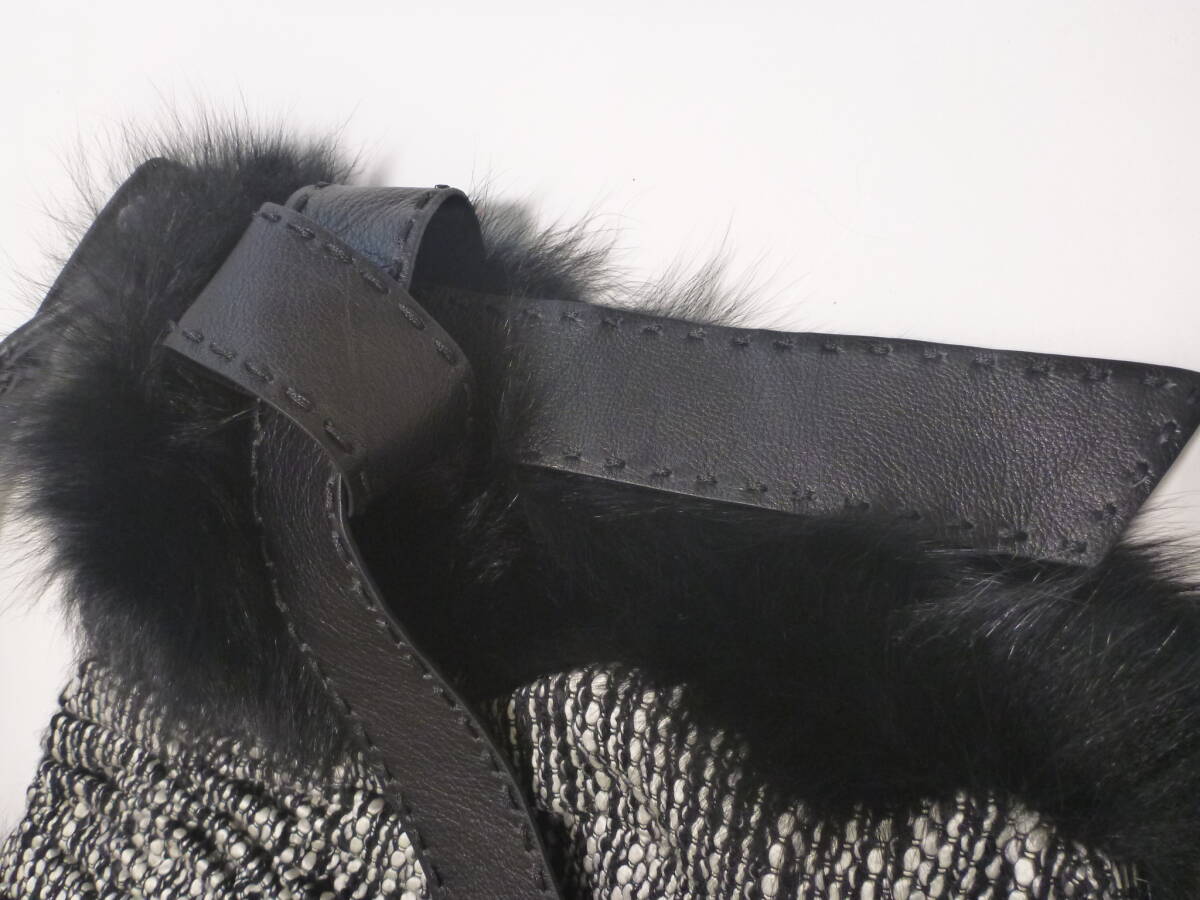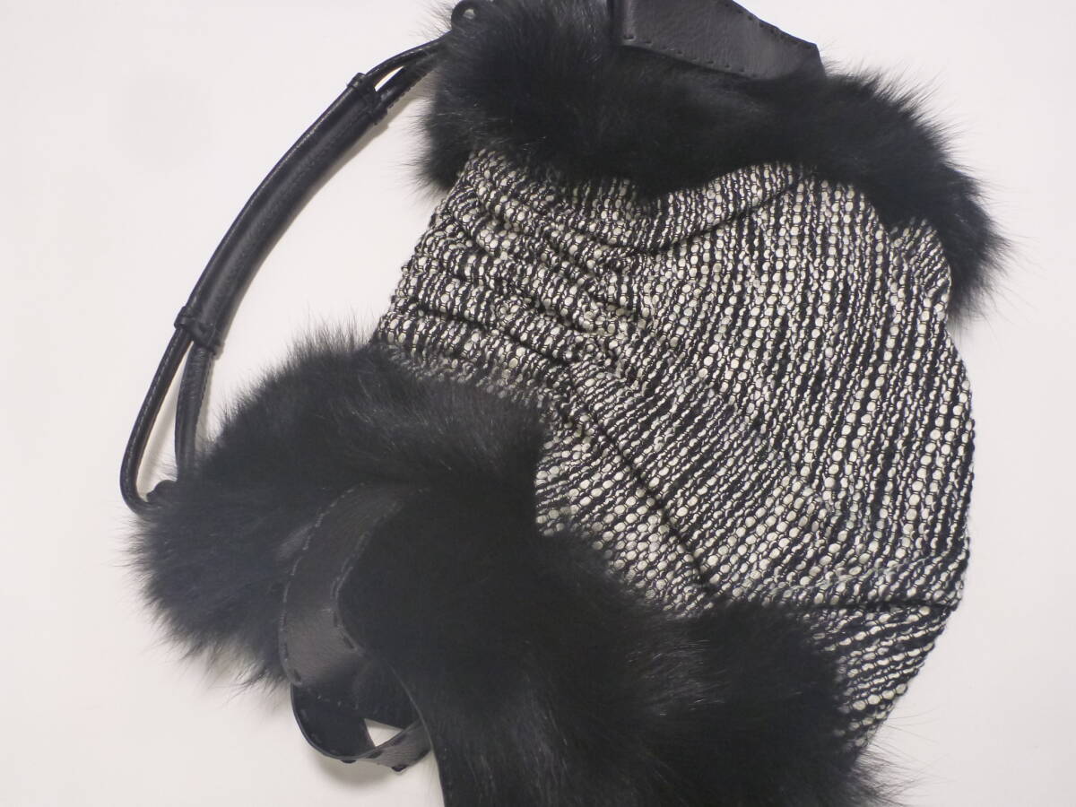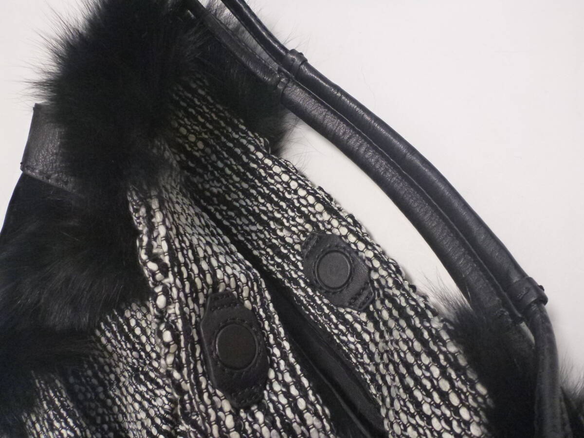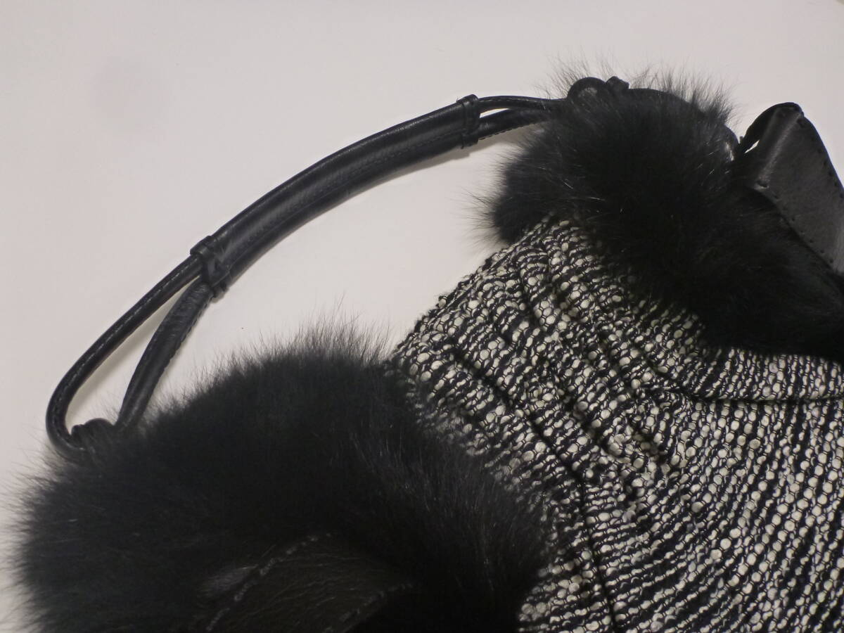 ◆黒白ツイード 本革 ラビットファー ハンドバッグ ロゴプレート