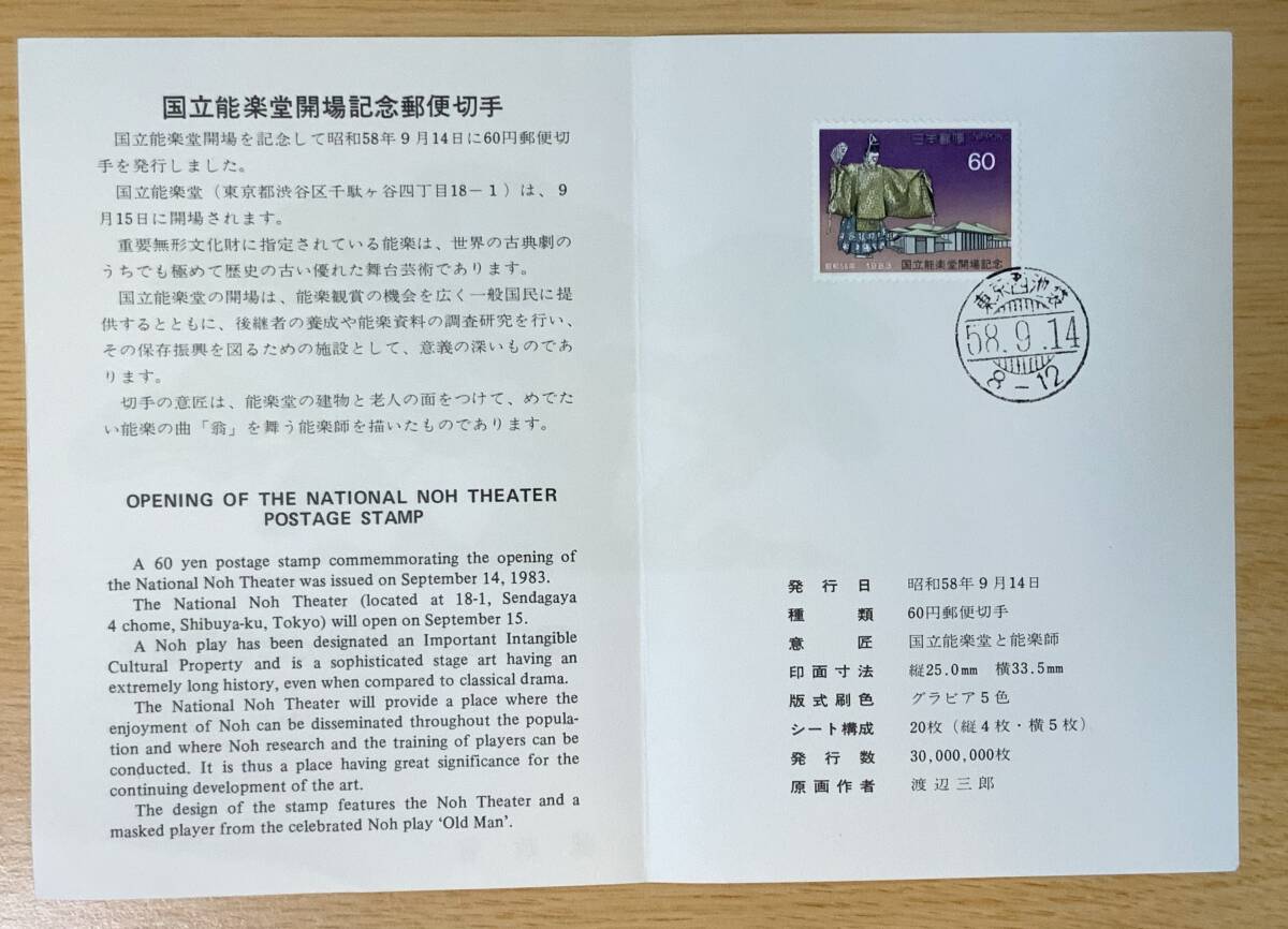 国立能楽堂開場記念郵便切手 解説書 初日スタンプ押印