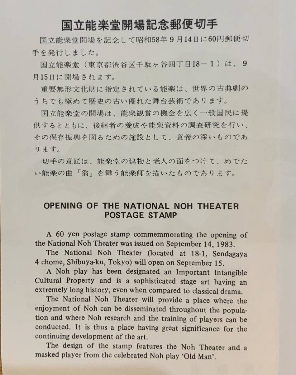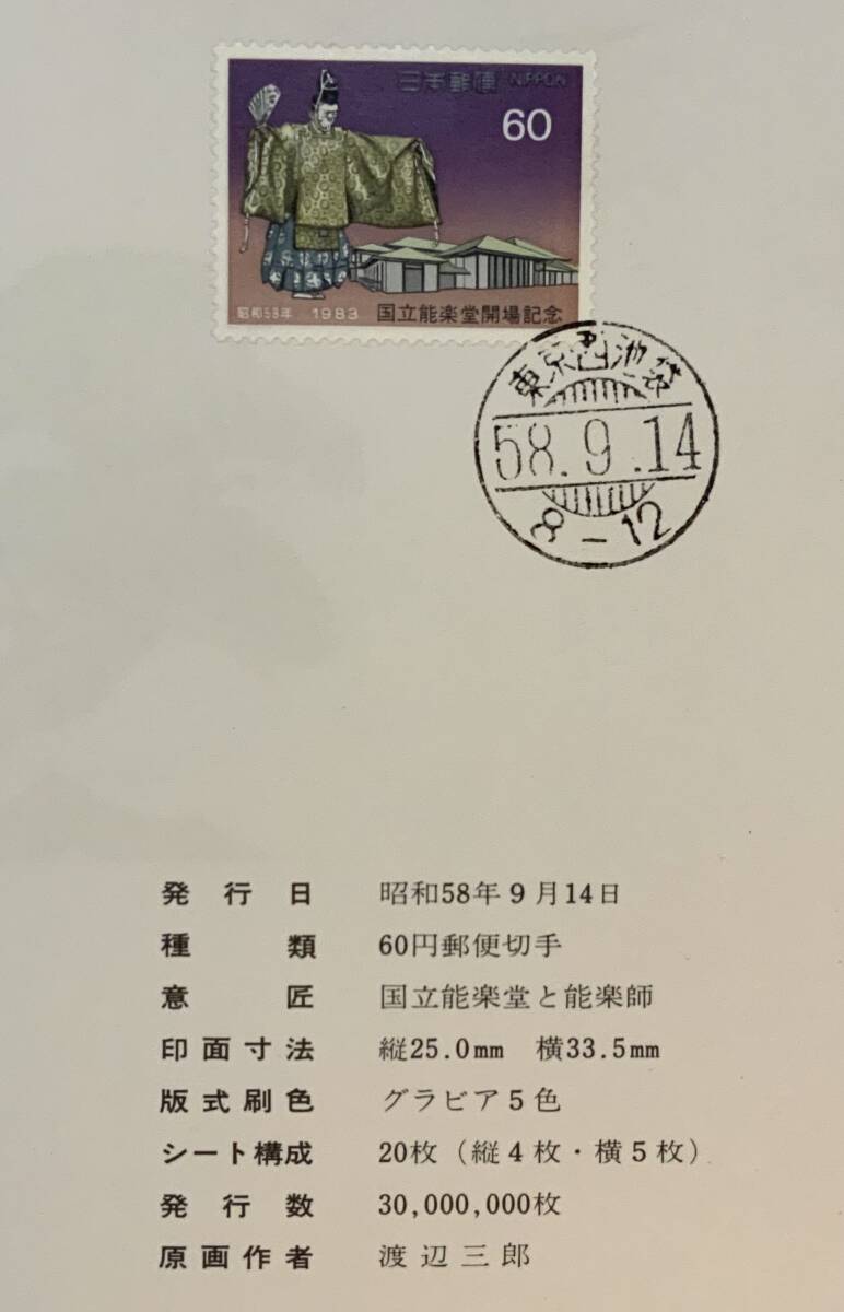 国立能楽堂開場記念郵便切手 解説書 初日スタンプ押印