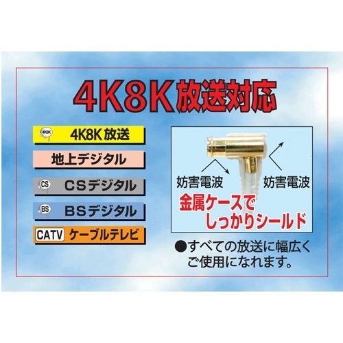 ●4K8K放送対応(3224MHz対応)●BS・CS・UHF・VHFなどのアンテナコネクタ(壁面端子)とテレビ・ビデオ・BS・CSチューナーなどを接続するアンテナケーブルです。●CS・BS・BSデジタル・UV・CATV等、現在放送されている全ての放送に幅広くご使用になれます。●テレビ・パソコン・DVD・ビデオ等、幅広い機器でご使用可能です。●プラグ加工部分をシールドしていますので外来電波を遮断します。●ストレートプラグ-L型プラグ●地上デジタル対応の4C-FBケーブル!●アルミシールド+編組シールドの2重シールド仕様。●75Ω同軸ケーブル使用。●環境にやさしい無鉛はんだを使用。※パッケージはありません。『 年末年始休暇のお知らせ 』 ■誠に勝手ながら、12月29日~1月3日は冬季休業とさせて頂きます。 ※休業日前の最終出荷は12/28(木)13:00迄にご入金・決済の確認ができたご注文までとさせて頂きます。 ■休業日中のご注文の対応、商品の発送、お問合せ等には、1月4日(木)以降に順次対応させて頂きます。 【ご覧いただきありがとうございます。弊社は50年以上に渡りTV関連のケーブルを販売しております。お困りの際は先ずはお気軽にご相談ください。営業時間は平日9時~17時(12~13時を除く)となります。小型の送料無料商品についてはメール便にて発送させていただきます。メール便は到着まで約2~4日ほどお時間がかかり、ポスト投函となりますのでご了承下さい。その他の商品や11000円以上の商品は宅配便にて発送させていただきます。なお、土日祝日は休業となりますので、出荷・お問い合わせについては行っておりません。ご迷惑をおかけしますが、予めご了承下さいますようお願いいたします。】