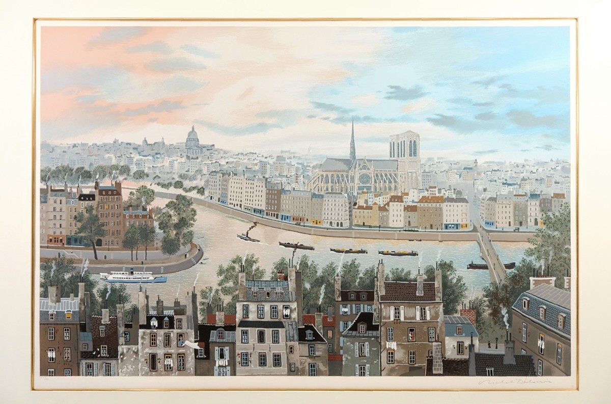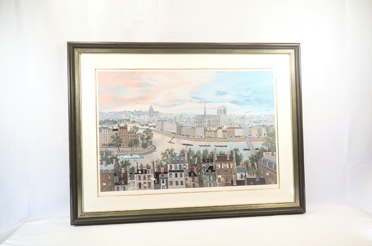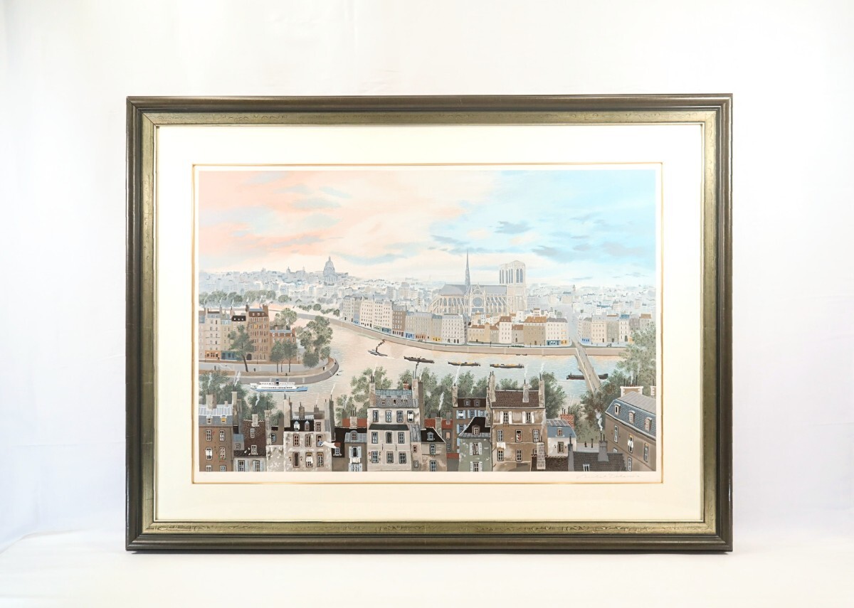 真作 ミッシェル・ドラクロワ 1990年大判シルクスクリーン「左岸」画96×63cm セーヌ河畔の街並みとノートルダム寺院 ワイドパノラマ 11131