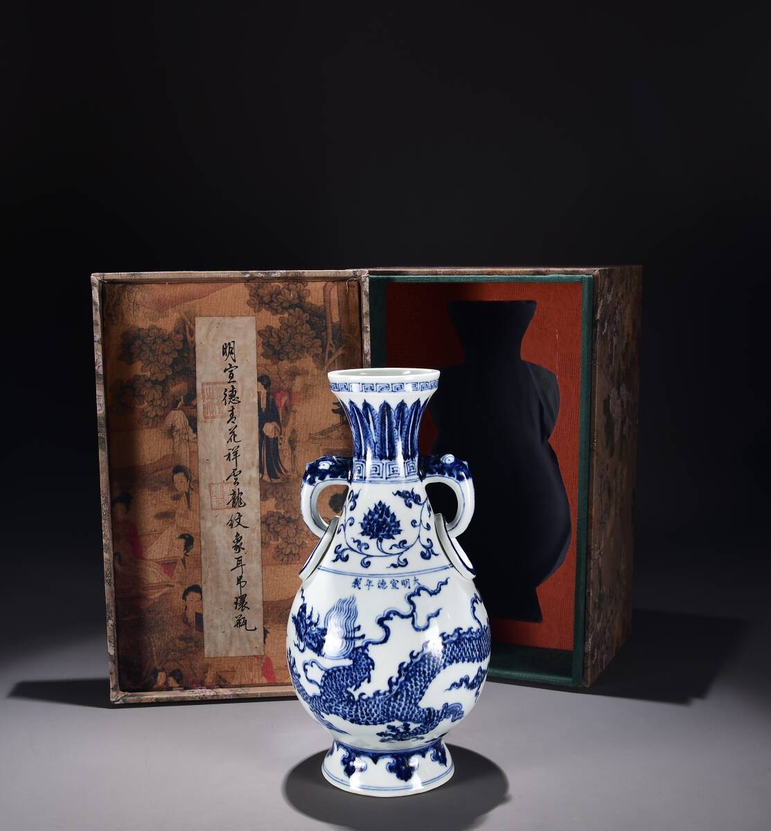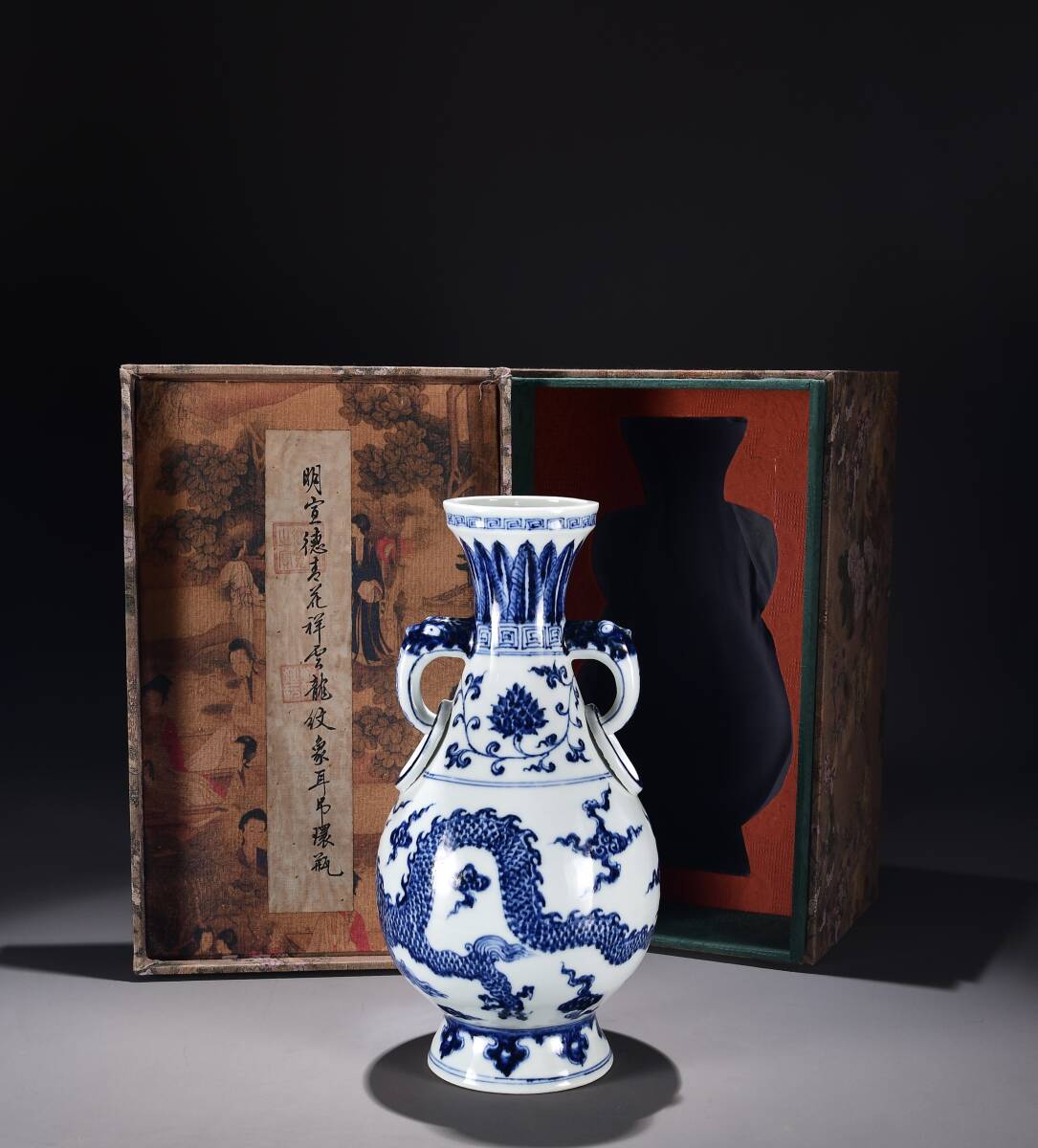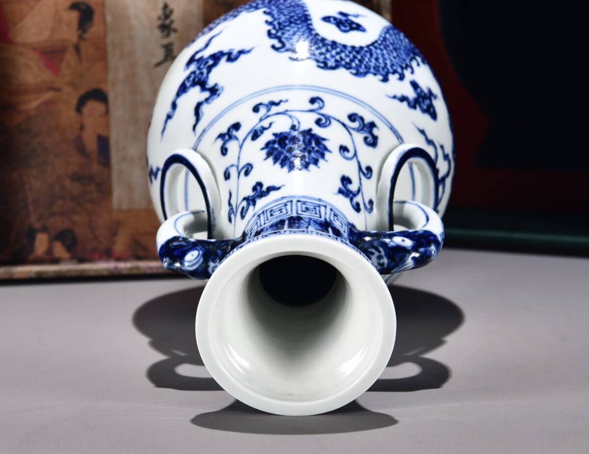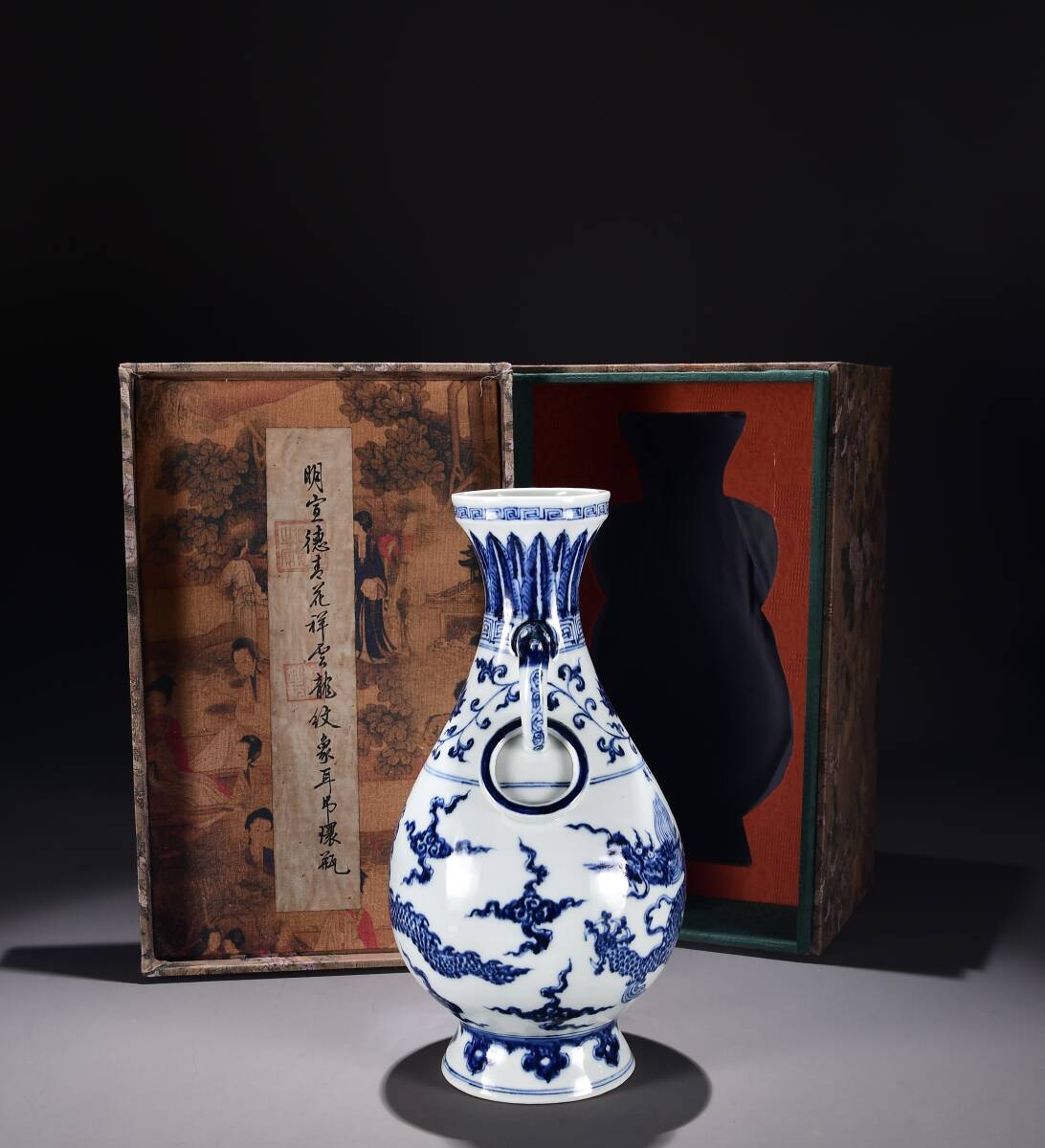 *珍品旧蔵* 明 宣德年製 青花 祥雲龍紋 象耳吊環瓶 陶芸 磁器 中国磁器 極細工 唐物 中国古玩 骨董品 古美味 H47