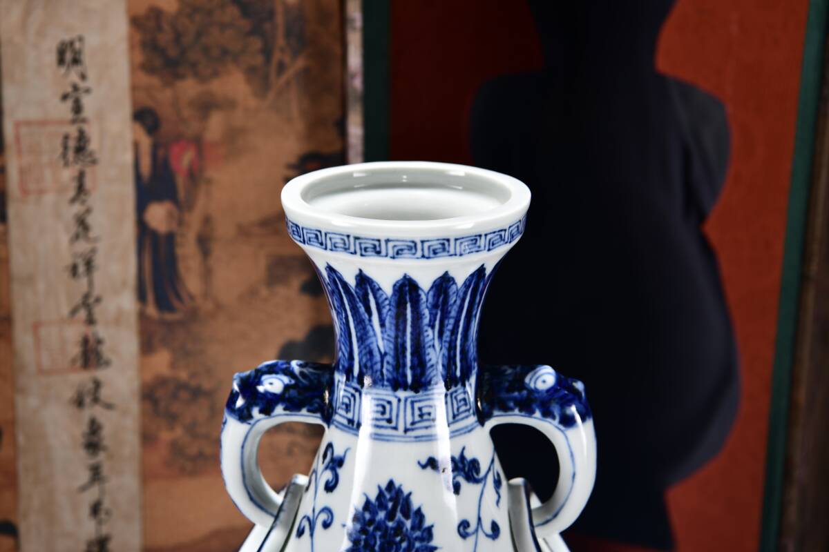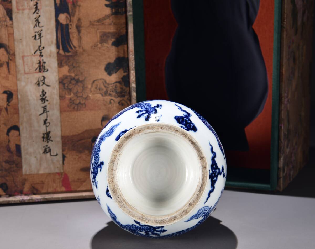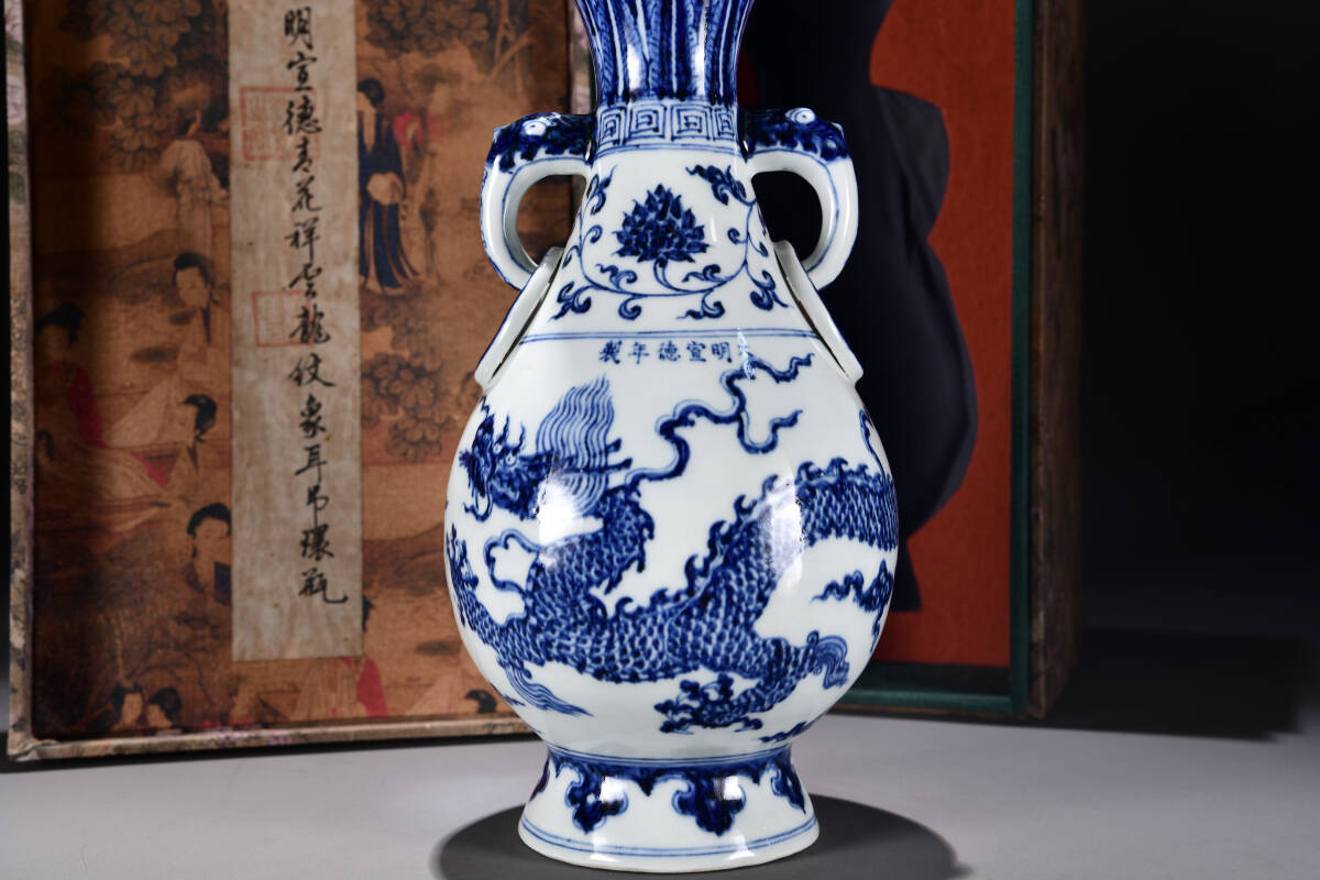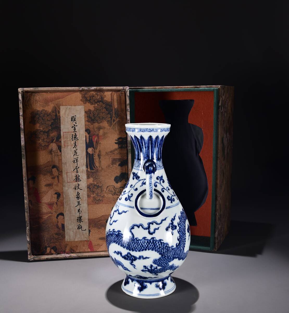 *珍品旧蔵* 明 宣德年製 青花 祥雲龍紋 象耳吊環瓶 陶芸 磁器 中国磁器 極細工 唐物 中国古玩 骨董品 古美味 H47