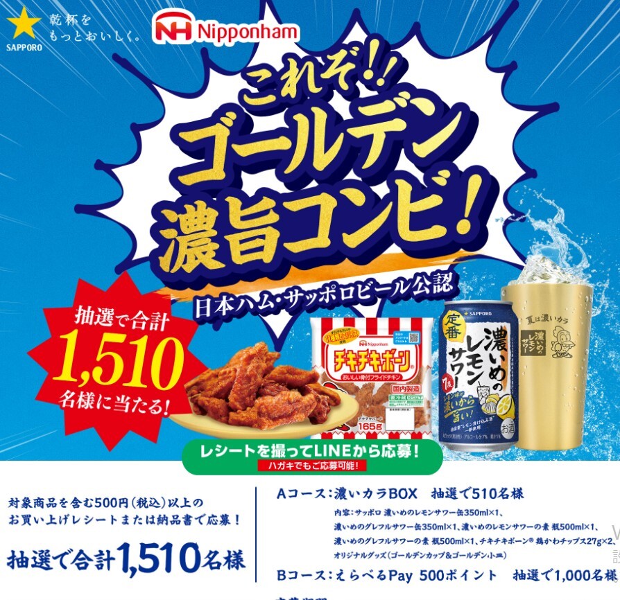 レシート懸賞応募 ゴールデン濃旨コンビが当たる濃いカラBOXキャンペーン 濃いカラBOXや選べるPay500ポイント当たる