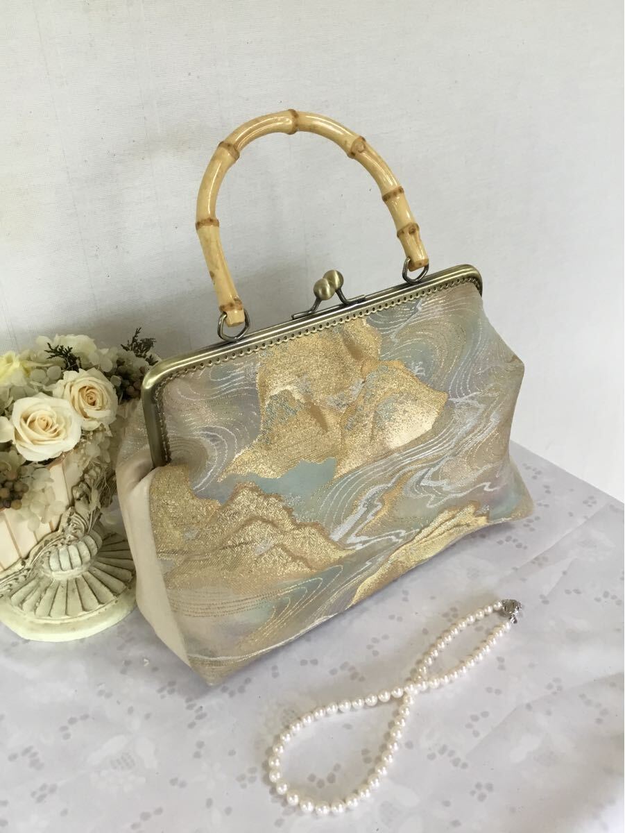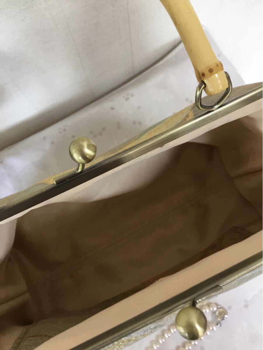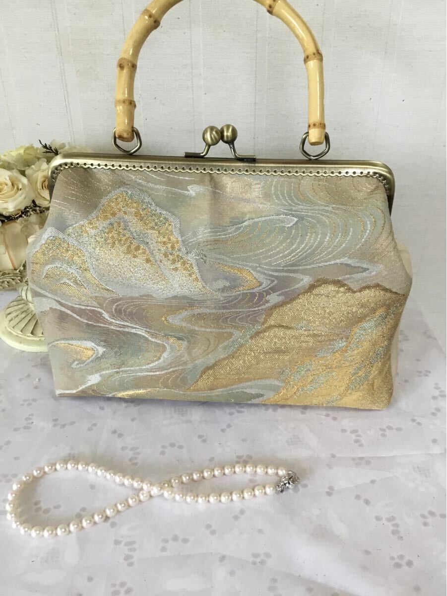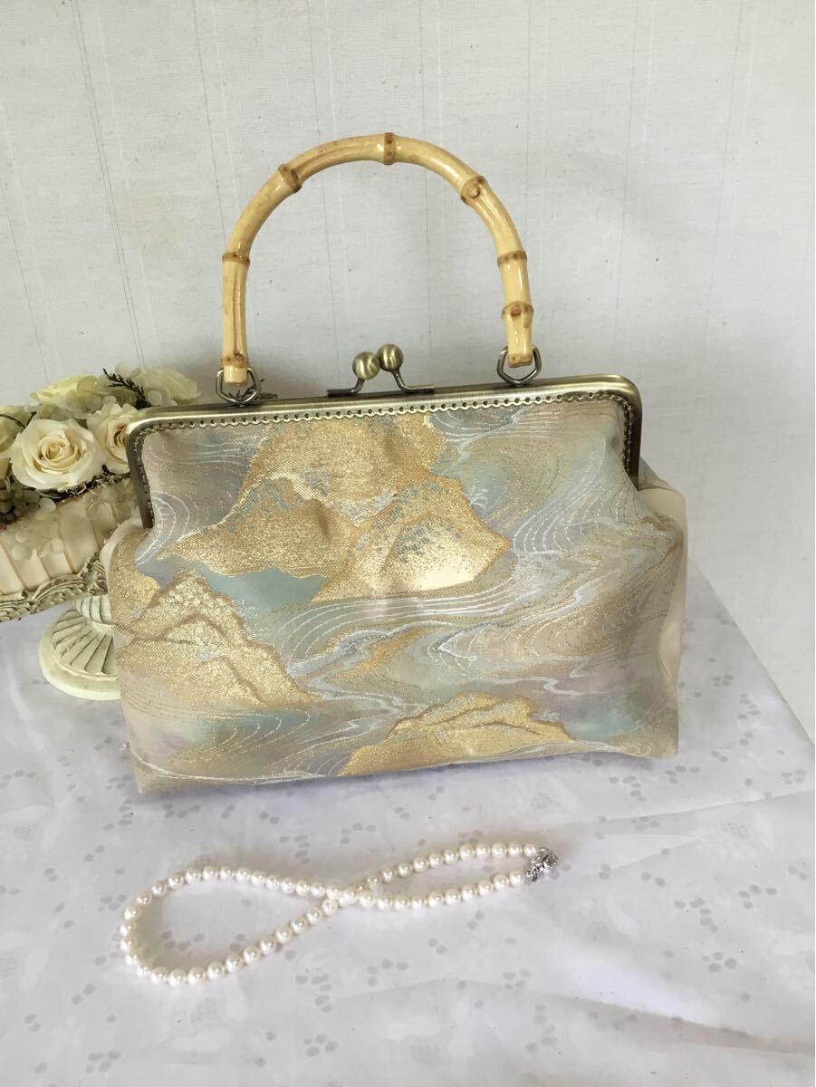 落ち着いた感じで光沢がありとても綺麗です。ゴールドで山の刺繍がしてあります。山の風景で洋服や着物と合わせやすく華やかなバックに仕上がっています。