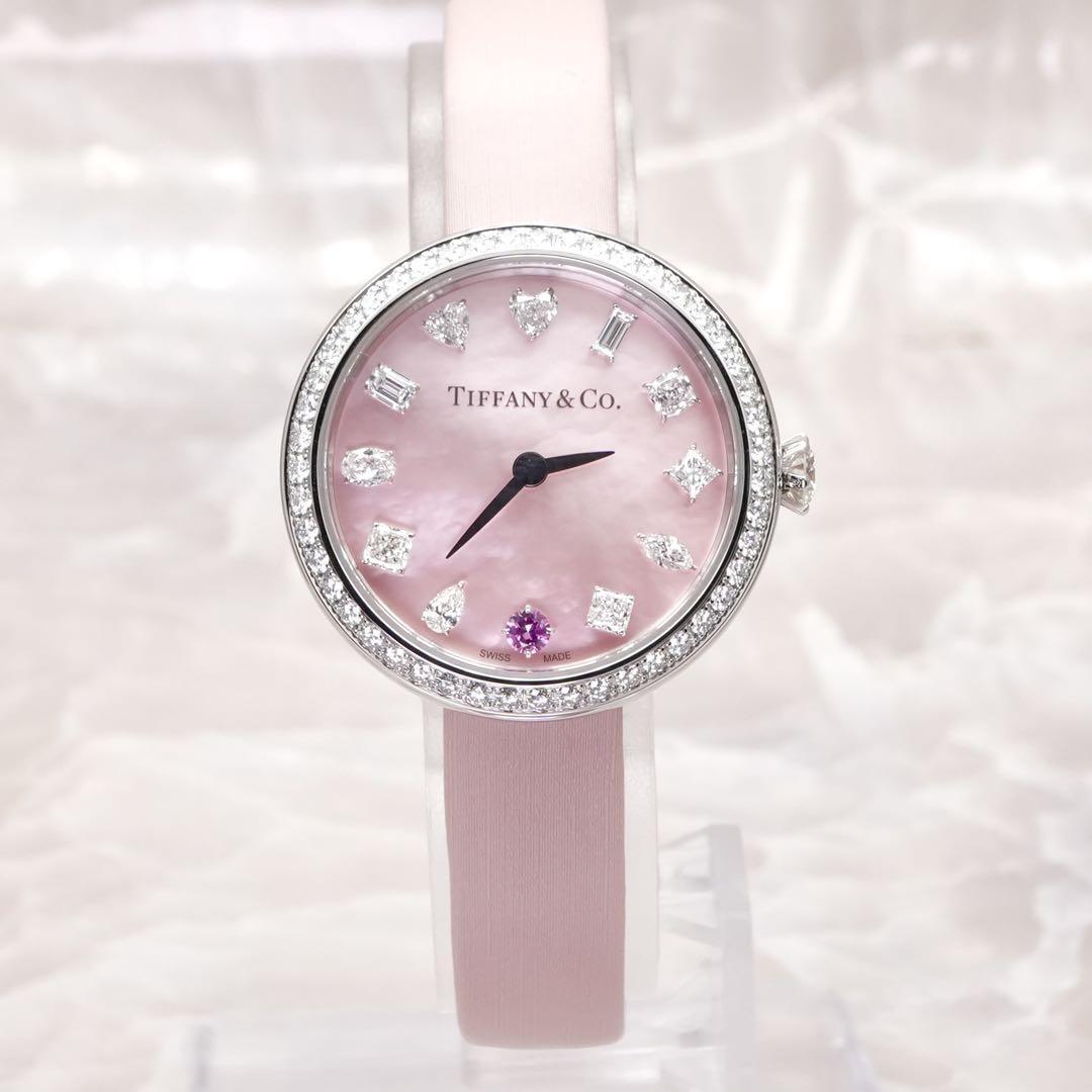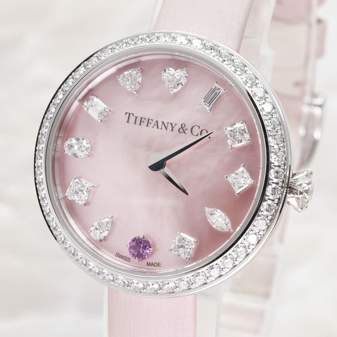ティファニー インデックスダイヤ 11Pダイヤ ピンクサファイア リューズダイヤ ベゼルダイヤ ピンクシェル文字盤 QZ クォーツ 女性用 レディース 腕時計