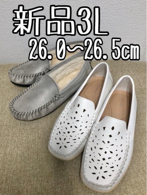 新品☆3L26~26.5♪白系カットワーク&グレー系エコファーモカシン☆w189