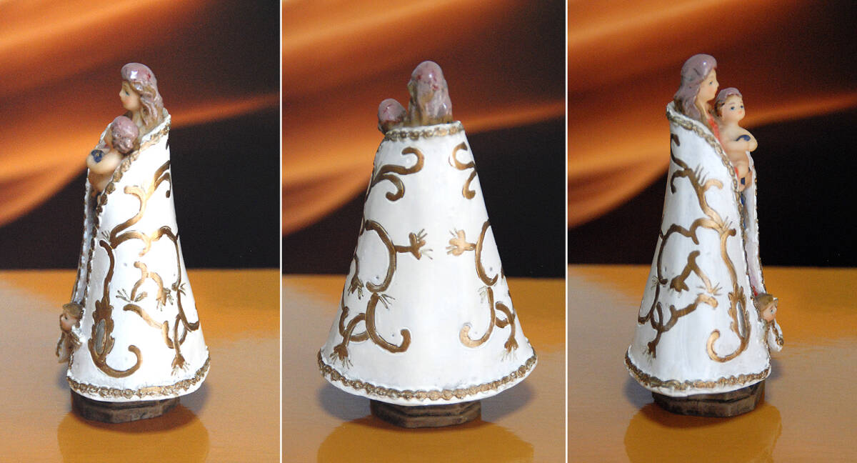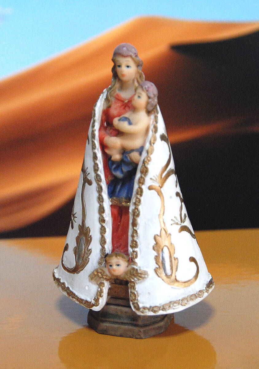 | * 商品説明 * ナザレの聖母(聖母子)の置物です。聖母マリアがイエスを抱いています。高さは約10cm、下部の幅は約6cm、台座の幅は約3cmです。小さいながら、ほんのりとした感じがします。底にあるCASA DE VELASは多分、ポルトガルのナザレ近くのホテルなのかな?と思いますが、定かではありません。お土産品だと思います。どうぞお部屋にでもお飾りください。 |
