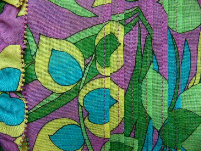 黄緑・水色・むらさき・赤むらさき・ピンク・ みどりの濃淡の柄プリントです。