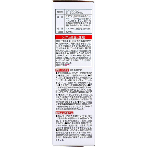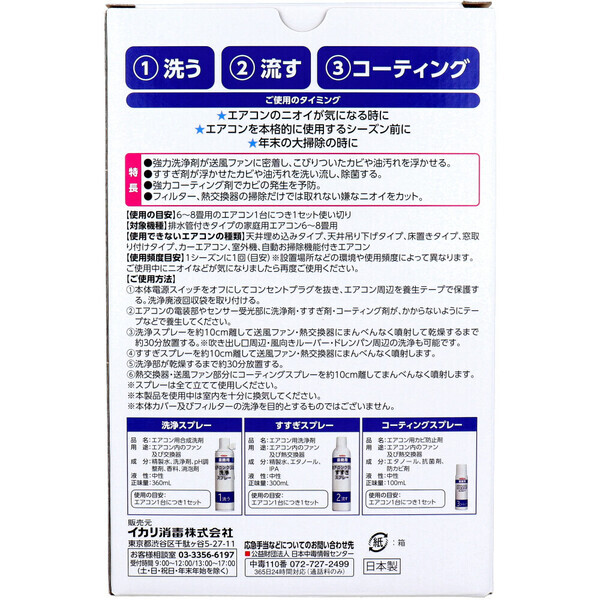 自分でできる!約3時間!本格!エアコン掃除! かんたん3ステップ! 洗浄・すすぎ・防カビコーティング ・強力洗浄剤が送風ファンに密着し、こびりついたカビや油汚れを浮かせる。 ・すすぎ剤が浮かせたカビや油汚れを洗い流し、除菌する。 ・強力コーティング剤でカビの発生を予防。 ・フィルター、熱交換器の掃除だけでは取れない嫌なニオイをカット。 ・ご使用のタイミング ・エアコンのニオイが気になる時に ・エアコンを本格的に使用するシーズン前に ・年末の大掃除の時に 【使用の目安】 6~8畳用のエアコン1台につき1セット使い切り 【ご使用方法】 (1)本体電源スイッチをオフにしてコンセントプラグを抜き、エアコン周辺を養生テープで保護する。 洗浄廃液回収袋を取り付ける。 (2)エアコンの電装部やセンサー受光部に洗浄剤・すすぎ剤・コーティング剤が、かからないようにテープなどで養生してください。 (3)洗浄スプレーを約10cm離して送風ファン・熱交換器にまんべんなく噴射して乾燥するまで約30分放置する。 ※吹き出し口周辺・風向きルーバー・ドレンパン周辺の洗浄も可能です。 (4)すすぎスプレーを約10cm離して送風ファン・熱交換器にまんべんなく噴射します。 (5)洗浄部が乾燥するまで約30分放置する。 (6)熱交換器・送風ファン部分にコーティングスプレーを約10cm離してまんべんなく噴射します。 ※スプレーは全て立てて使用しください。 ※本製品を使用中は室内を十分に換気してください。 ※本体カバー及びフィルターの洗浄を目的とするものではございません。 個装サイズ:160X250X72mm 個装重量:約1011g 内容量:1セット 製造国:日本 【販売元:イカリ消毒株式会社】 【対象機種】 排水管付きタイプの家庭用エアコン6~8畳用 【使用できないエアコンの種類】 天井埋め込みタイプ、天井吊り下げタイプ、床置きタイプ、窓取り付けタイプ、カーエアコン、室外機、自動お掃除機能付きエアコン 【使用頻度目安】 1シーズンに1回 (目安)※設置場所などの環境や使用頻度によって異なります。 ご使用中にニオイなどが気になりましたら再度ご使用ください。 【エアコン1台分セット(廃液回収袋付き)】 ★洗浄スプレー 品名:エアコン用合成洗剤 用途:エアコン内のファン及び交換器 成分:精製水、洗浄剤、pH調整剤、香料、消泡剤 正味量:360mL ★すすぎスプレー 品名:エアコン用洗浄剤 用途:エアコン内のファン及熱交換器 成分:精製水、エタノール、IPA 液性:中性 正味量:300mL ★コーティングスプレー 品名:エアコン用カビ防止剤 用途:エアコン内のファン及び熱交換器 成分:エタノール、抗菌剤、防カビ剤 液性:中性 正味量:100mL ★使用の目安:エアコン1台につき1セット 【使用上の注意】 ★吸入飲用不可 ・取扱説明書よく読んだ上で使用すること。 ・用途以外には使用しないこと。 ・吸入しないように作業中は必ず換気をすること。 取り扱い時にはゴム又はビニール手袋、マスク、保護メガネ等を着用すること。 ・人に向かって噴霧しないこと。 ・アレルギー症状やかぶれなどを起こしやすい人、喘息の症状がある人、病人、妊婦、乳幼児などがいる場所では使用しないこと。 ・皮膚に付着した場合は水で洗うこと。 目に入った場合大量の水で洗い流すこと。 いずれの場合も異常があれば直ちに医師の診断を受けること。 ・吸入した場合は空気の新鮮な場所に移動し呼吸しやすい姿勢で休息させること。 異常があれば直ちに医師の診断を受けること。 【保管及び廃棄方法】 ・なるべく冷所で直射日光・火気・水回り・湿気の多い場所をさけ、食品などと区別して、子供の手の届かない場所に保管すること。 ・車の中や暖房器具 (ファンヒーター等)の付近に置くと温度が上がり破裂する危険があるので置かないこと。 ・廃棄の際は、火気の無い通気性のある屋外でガス抜きキャップを利用するか、噴射音が消えるまでボタンを押してガスを抜き、各自治体の廃棄方法に従い廃棄すること。 注意事項 ※予告なく成分・パッケージが変更になることがございます。 予めご了承ください。 *予告なく成分・パッケージが変更になることがございます。予めご了承ください *ダンボールを使用して発送する場合には、入数以下の個数の場合、 中古ダンボールを使用する場合があり、ご注文の商品とは異なるダンボールになる場合があります。 あらかじめ、ご了承ください。 |
