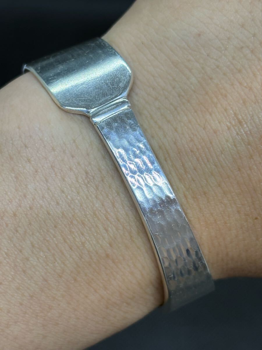 サイズは実寸、内周約12.9㎝、開口部約3.6㎝程度です。(バターナイフのバングルですのでご自身で多少広げたり縮めたり可能です)