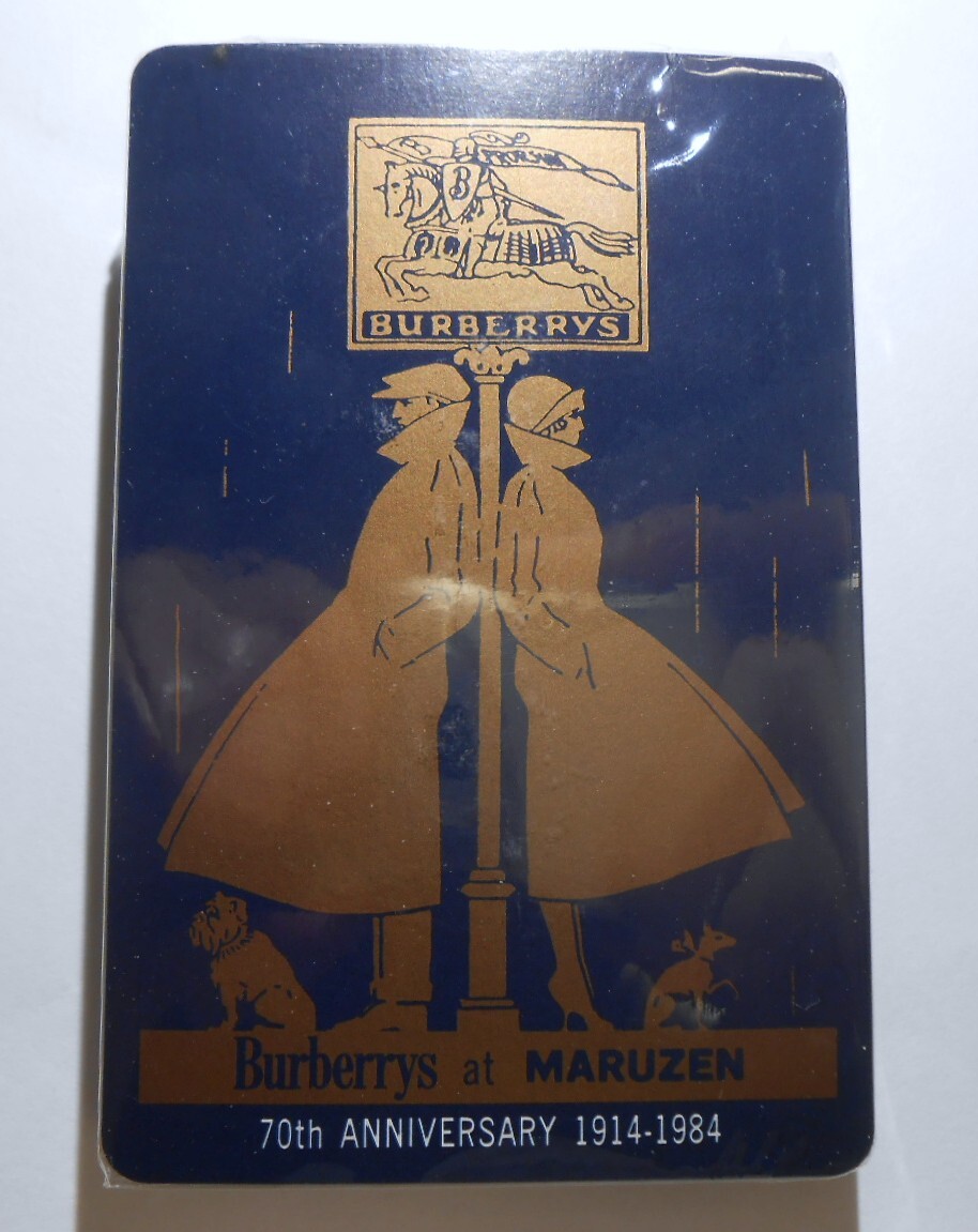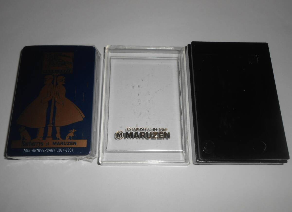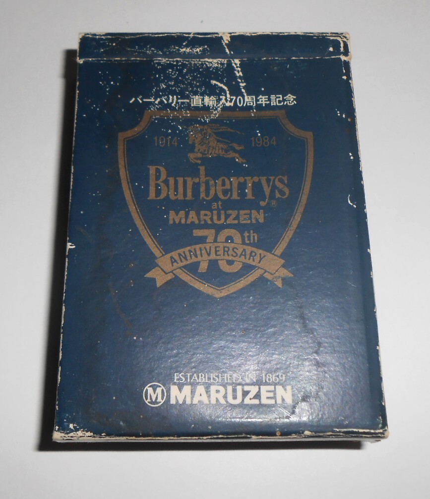 丸善がバーバリー製品の直輸入を開始して70年となるのを記念して、1984年に製作させたトランプのようです。箱に入れたまま未使用で保管されてきたようで、カードはきれいな状態ですが、外箱やプラスチックケースにはスレや汚れ、傷みなどあります。カードの大きさ約8,8×5,8cmです。レターパックライトでの発送も可能ですが、厚さ制限のため、ほとんど梱包できませんので、その点ご了承いただける方のみご指定下さい。
