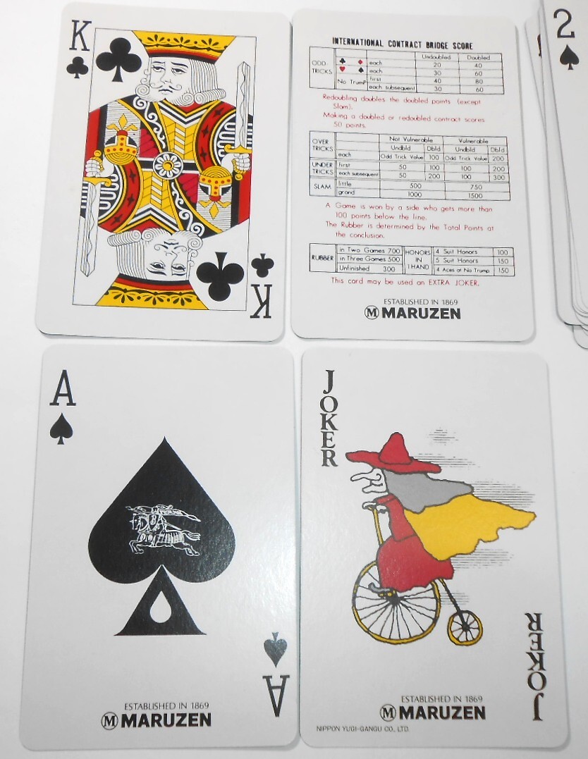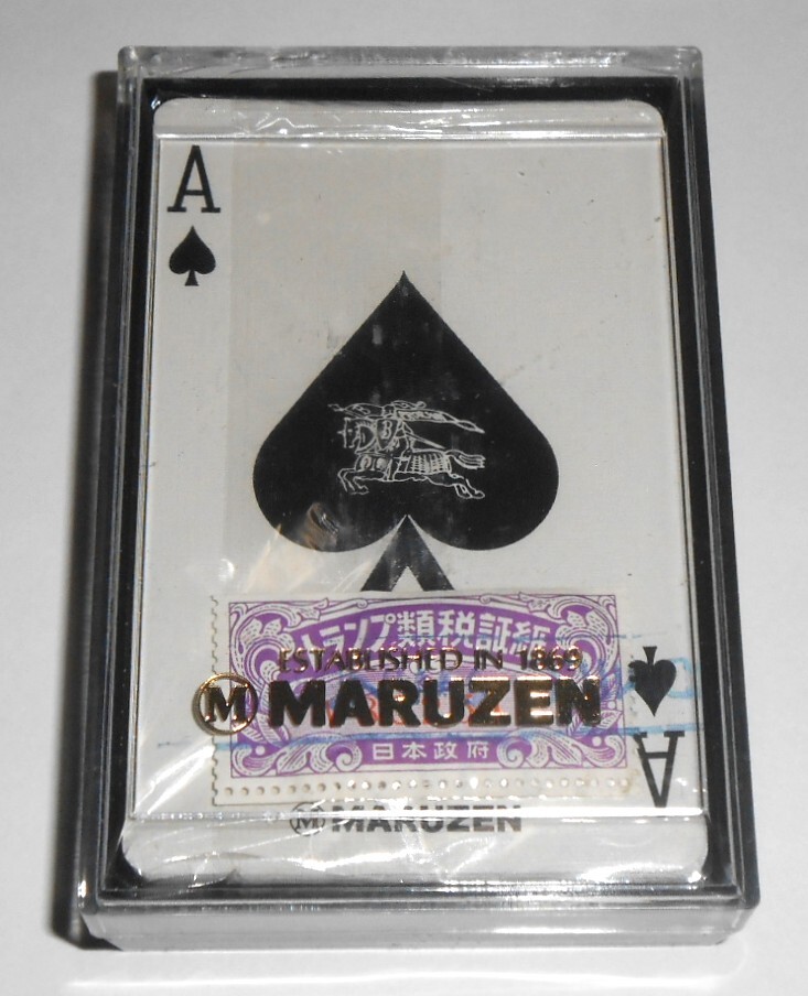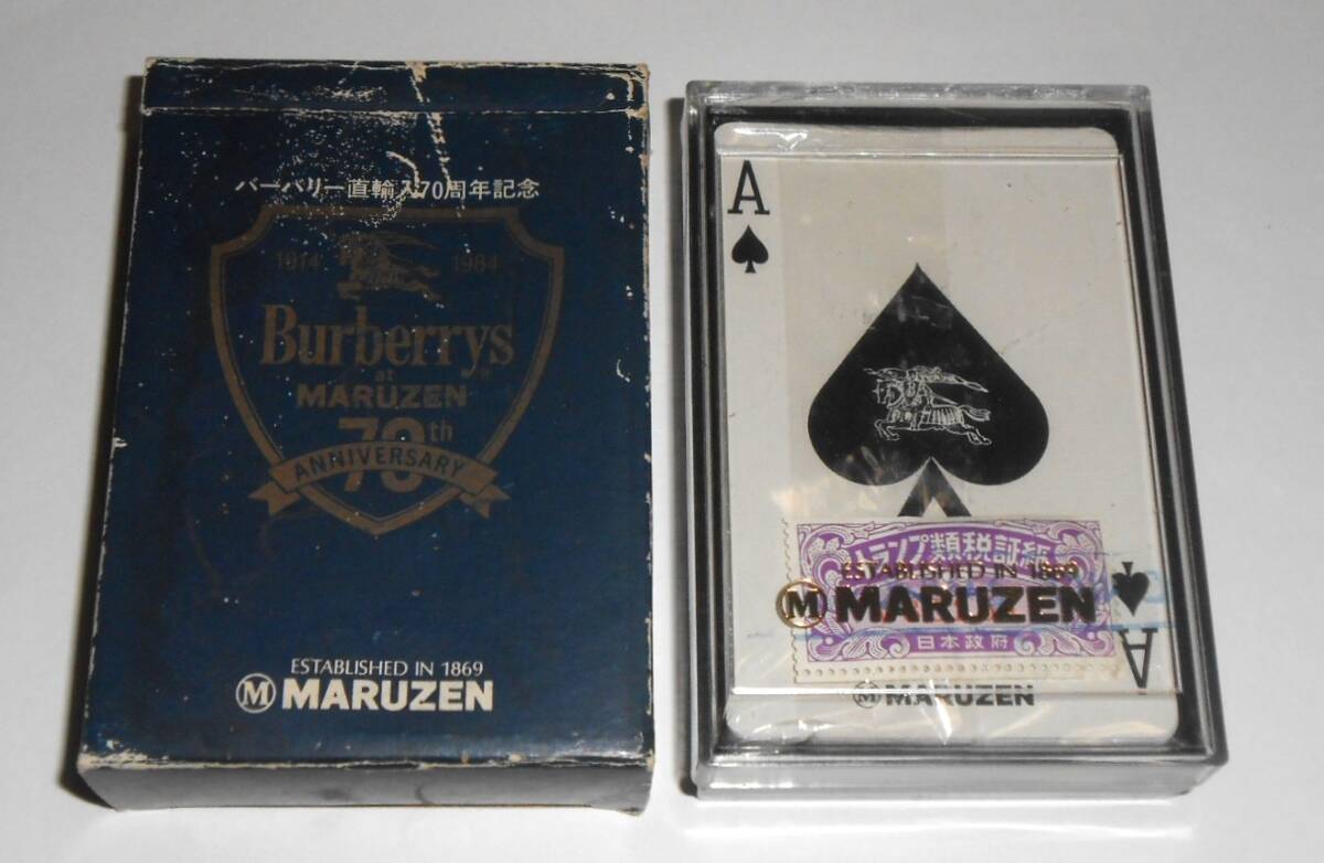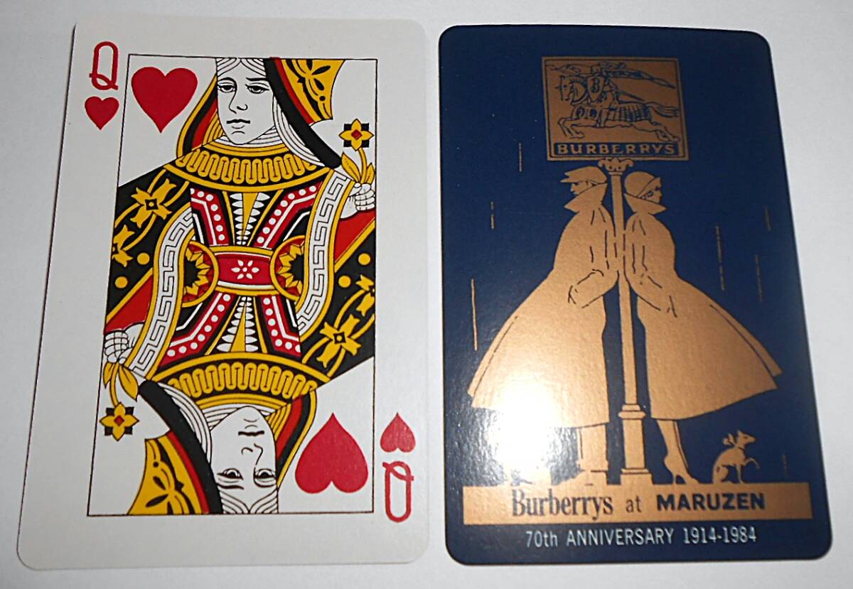 丸善がバーバリー製品の直輸入を開始して70年となるのを記念して、1984年に製作させたトランプのようです。箱に入れたまま未使用で保管されてきたようで、カードはきれいな状態ですが、外箱やプラスチックケースにはスレや汚れ、傷みなどあります。カードの大きさ約8,8×5,8cmです。レターパックライトでの発送も可能ですが、厚さ制限のため、ほとんど梱包できませんので、その点ご了承いただける方のみご指定下さい。