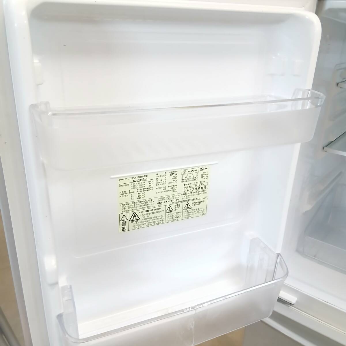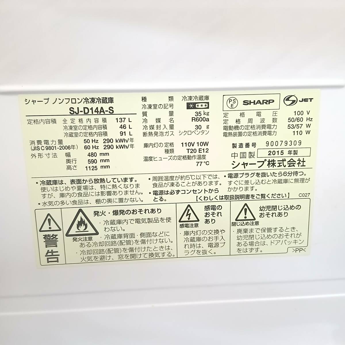 2ドア 冷凍冷蔵庫 メーカー:SHARP 型番: SJ-D14A-S 容量 ・全容量:137L ・冷蔵室:91L ・冷凍室:46L 製造年:2015年製 サイズ:約 110×48×59(高さ×横幅×奥行)cm 重量:約35kg | |
