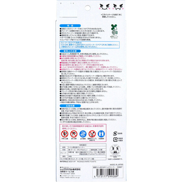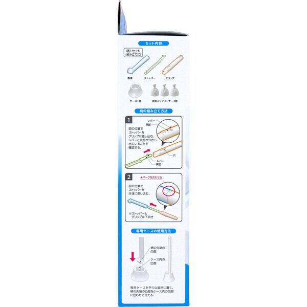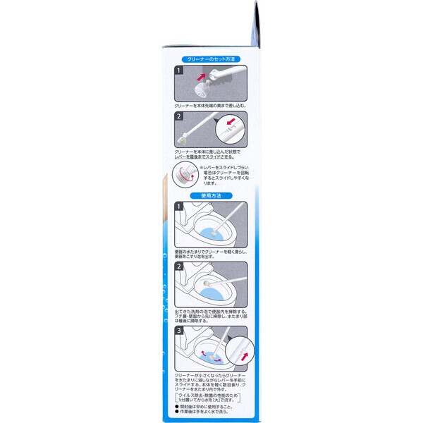 汚れたブラシは卒業! レバーを引いてパッと流せる。 ・洗剤入りのクリーナーで水につけてそのまま洗えます。 ・クリーナーは掃除が終わったらそのままトイレに流せます。 ・汚れたクリーナーを毎回取り換えられて清潔です。 ・便器を洗ってウイルス除去・除菌ができます。 ※すべての菌・ウイルスを除去するわけではありません。 ※エンベロープ型ウイルスで試験を実施。 ・無香料・無着色。 ・本体セット+クリーナー3個入。 個装サイズ:100X260X60mm 個装重量:約205g 内容量:1セット 製造国:日本 【発売元:レックケミカル株式会社】 【品名】 トイレ用洗浄クリーナー 【材質】 本体(柄・ケース):ポリプロピレン クリーナー:紙 【成分】 クリーナー:炭酸水素ナトリウム、クエン酸、除菌剤、界面活性剤(アルキルアミンオキシド) 【液性】 中性 【耐熱温度】 本体:50度 【セット内容】 ・柄1セット(組立式):本体、ストッパー、グリップ ・ケース1個 ・洗剤入りクリーナー3個 【柄の組み立て方法】 (1)ストッパーをグリップに差し込む。 レバーと突起が穴から出ていることを確認する。 (2)ストッパーを本体に差し込む。 ※ストッパーとグリップは下向き。 【専用ケースの使用方法】 ・専用ケースを平らな場所に置く。 柄の先端の凸部をケース内の凹部に合わせて立てる。 【クリーナーのセット方法】 (1)クリーナーを本体先端の奥まで差し込む。 (2)クリーナーを本体に差し込んだ状態でレバーを最後までスライドさせる。 ※レバーをスライドしづらい場合はクリーナーを回転するとスライドしやすくなります。 【使用方法】 (1)便器の水たまりでクリーナーを軽く濡らし、便器をこすり泡を出す。 (2)出てきた洗剤の泡で便器内を掃除する。 フチ裏・壁面から先に掃除し、水たまり部は最後に掃除する。 (3)クリーナーが小さくなったらクリーナーを水たまりに浸しながらレバーを手前にスライドする。 本体を軽く数回振り、クリーナーを水たまり内で外す。 (ウイルス除去・除菌の性能のため5分置いてから水を「大」で流す。) ・開封後は早めに使用すること。 ・作業後は手をよく水で洗う。 【応急処置】 ・洗剤が目に入った時は、水で数分間注意深く洗ってください。 眼の刺激が続く場合は医師の診断、手当てを受けてください。 ・洗剤を飲み込んだ時は口をすすぎ、気分が悪いときは医師の診断、手当てを受けてください。 ・洗剤が皮膚についた時は、多量の水と石けんでやさしく洗ってください。 異常がある場合は、医師の診断、手当てを受けてください。 ・気分が悪くなった時は、使用を中止し、異常が残る場合は医師に相談してください。 ・いずれも受診時は商品を持参してください。 注意事項 ※予告なく成分・パッケージが変更になることがございます。 予めご了承ください。 *予告なく成分・パッケージが変更になることがございます。予めご了承ください *ダンボールを使用して発送する場合には、入数以下の個数の場合、 中古ダンボールを使用する場合があり、ご注文の商品とは異なるダンボールになる場合があります。 あらかじめ、ご了承ください。 |