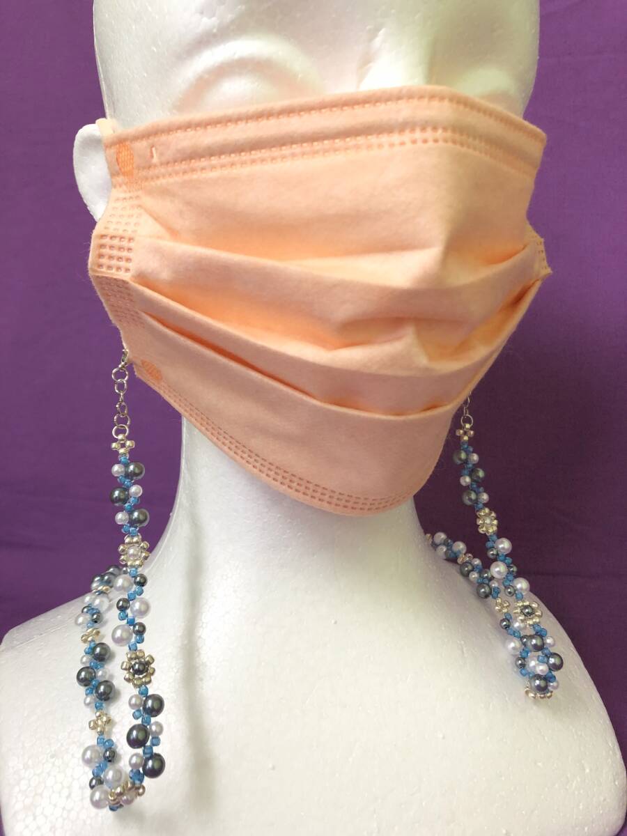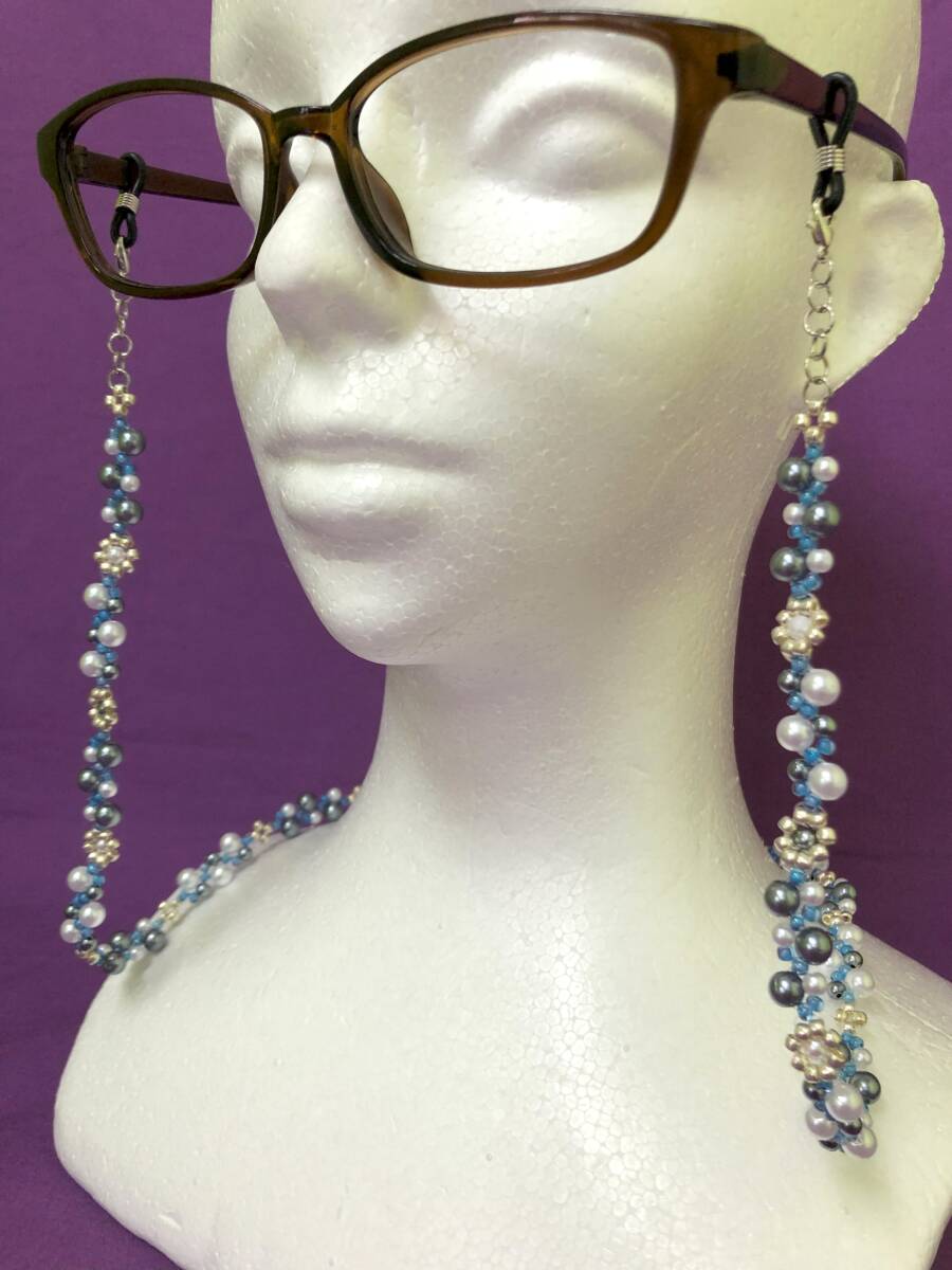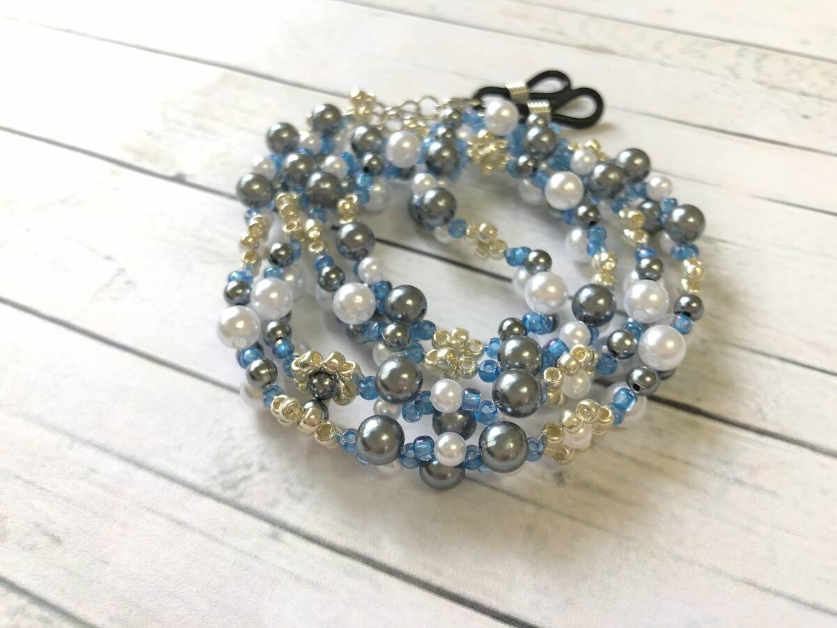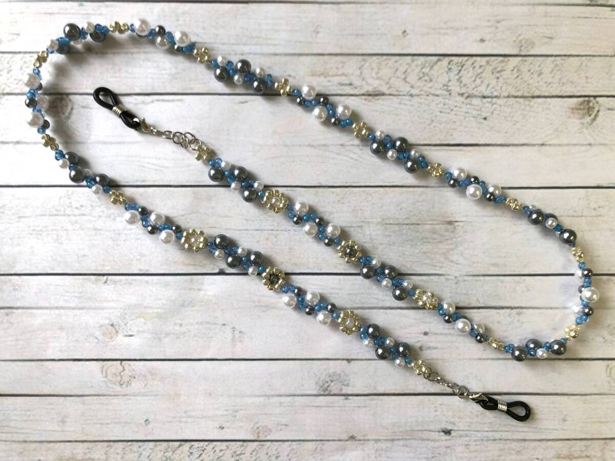 メガネチェーン マスクストラップ 丸ビーズ パール ガンメタ ブルー ハンドメイド 全長70cm A377