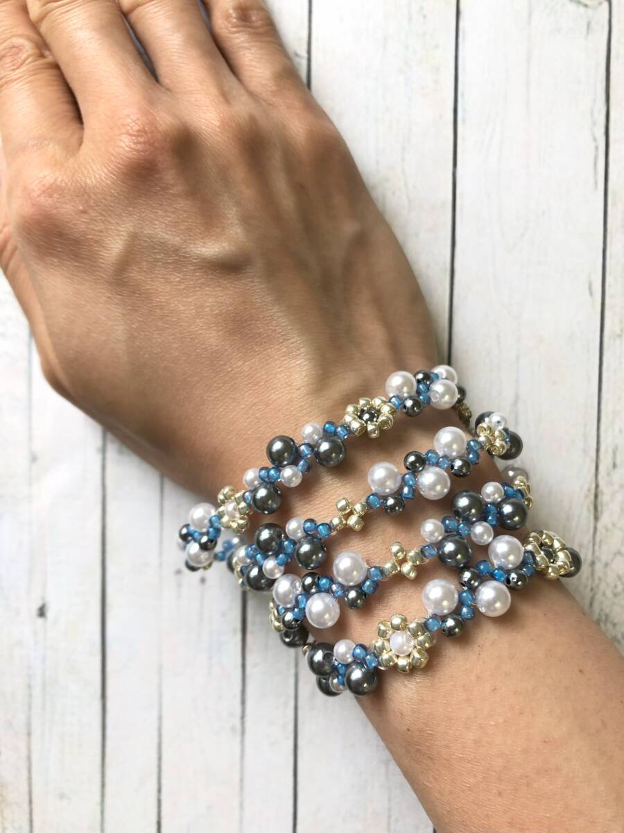 ブルーのビーズが良いアクセントとなっており、柔らかい印象になっています。