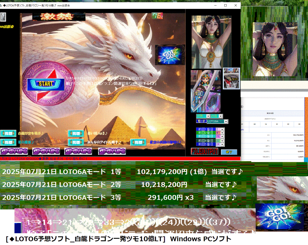 夏新作 [◆LOTO6予想ソフト_白龍ドラゴン一発ツモ10億LT] 2025年07月21日 LOTO6Aモード 1等  102,179,200円 (1億) 当選です♪