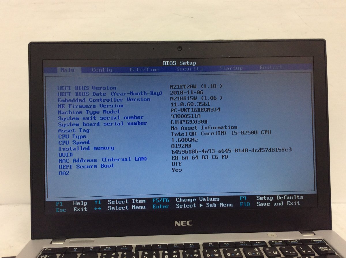 ジャンク/ NEC PC-VKT16BEGN3J4 Intel Core i5-8250U メモリ8.19GB ストレージ無し 【K18554】