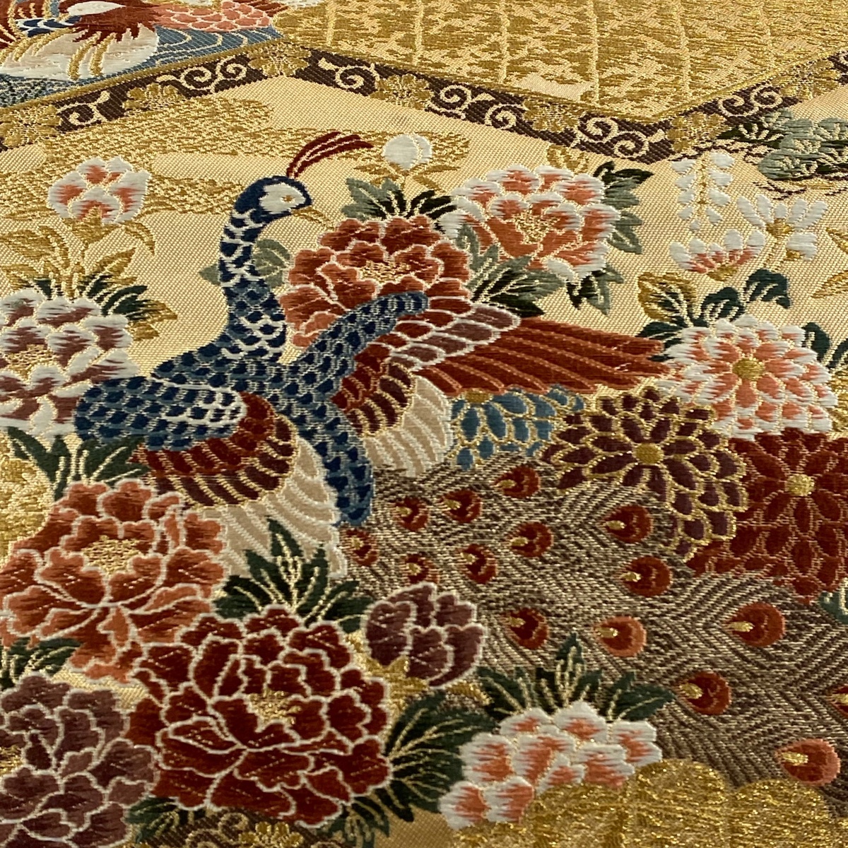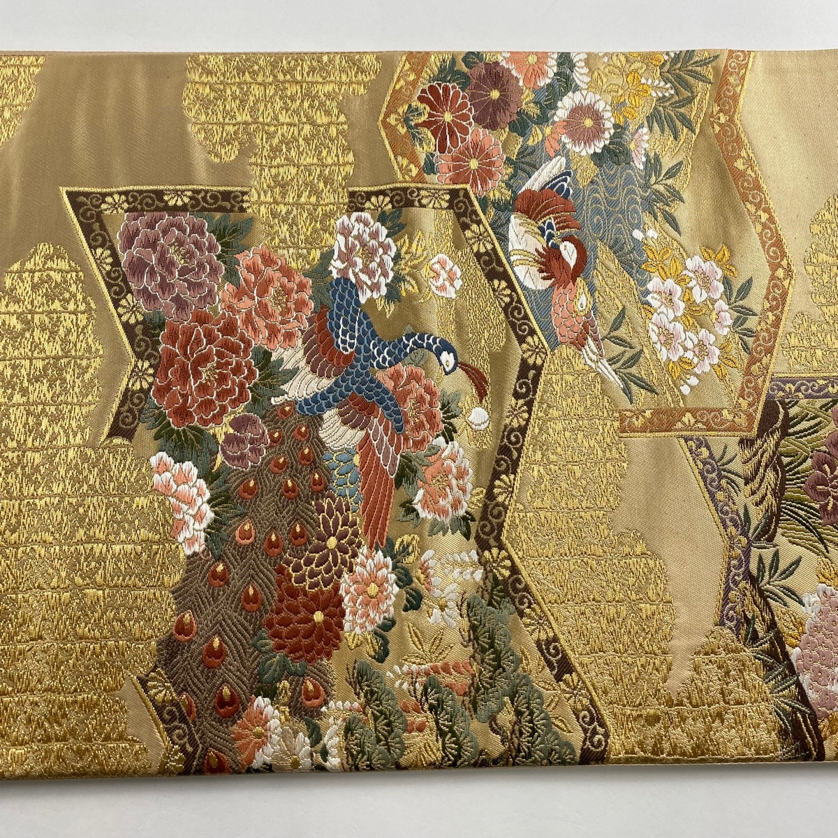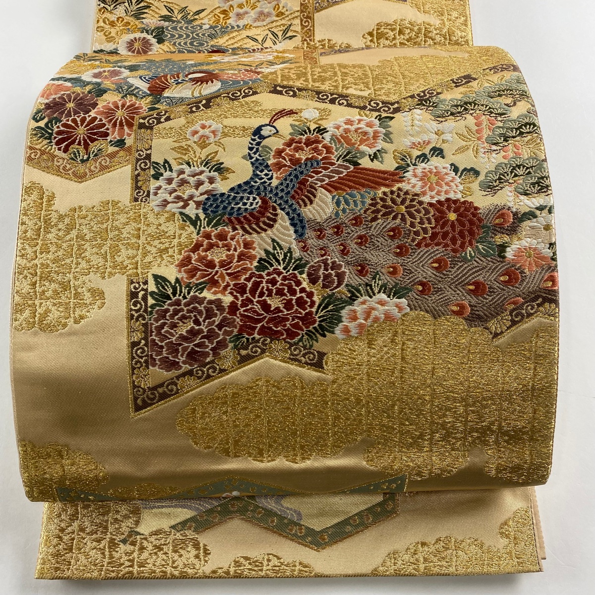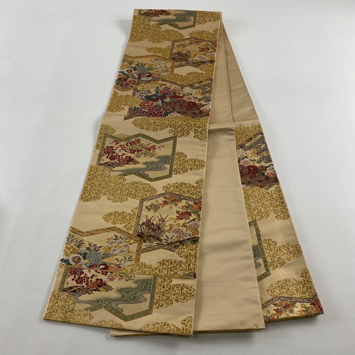 | 袋帯 美品 秀品 関西仕立て 屏風 花鳥 金糸 箔 金色 六通 正絹 【中古】 |