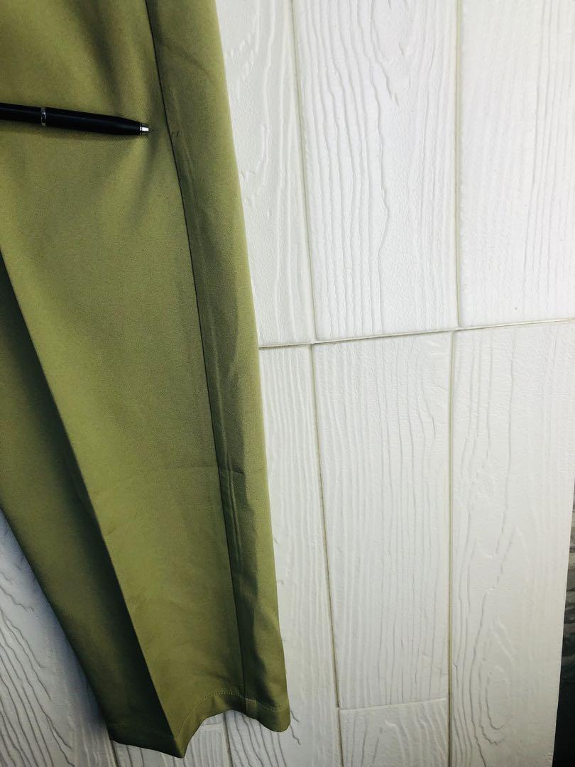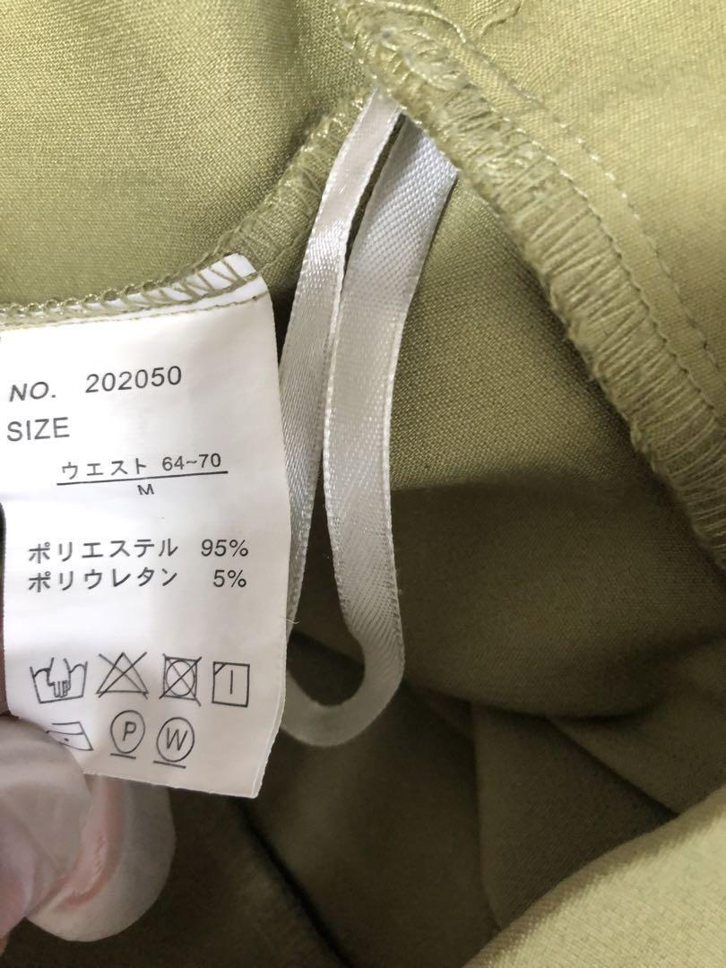 オリーブグリーンのスラックス、ウエスト64cm、股下64cm、前股上24cmのスタイリッシュなデザイン。
