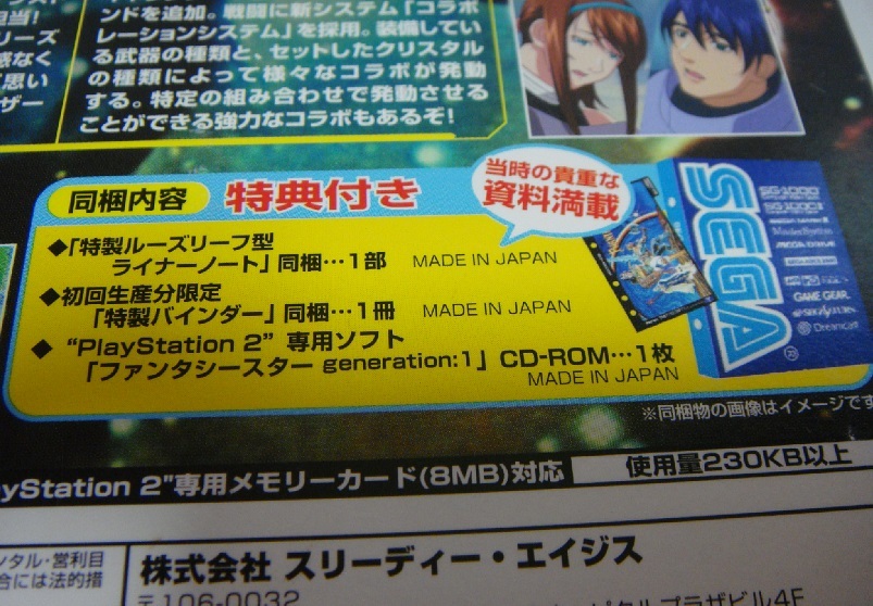 | ●ゲームソフト1本の出品になります。プレイステーション2ゲームソフト お送りするお品物 超激レア!初回限定ボックスBOX ファンタシースター ジェネレーション1 PHANTASY STAR GENERATION:1 付属品完品! ハードケース あり 特製バインダー あり 特製ルーズリーフ型ライナーノート あり パッケージ あり 取説 あり ゲームケースは無水エタノールにて消毒済み ●動作確認 通常通りゲーム立ち上がります タイトル画面、ゲーム開始まで読み込み確認済み ●その他 品物の状態などは写真を参照してください。 盤面は綺麗で美品です。 中古品なのをご理解いただきご入札よろしくお願いいたします。 |