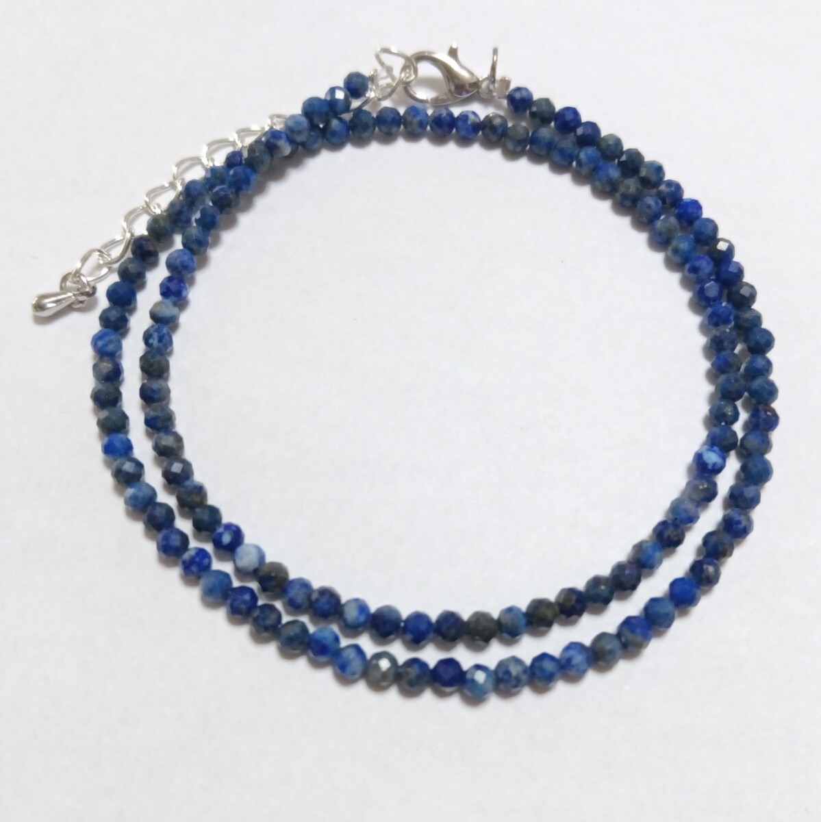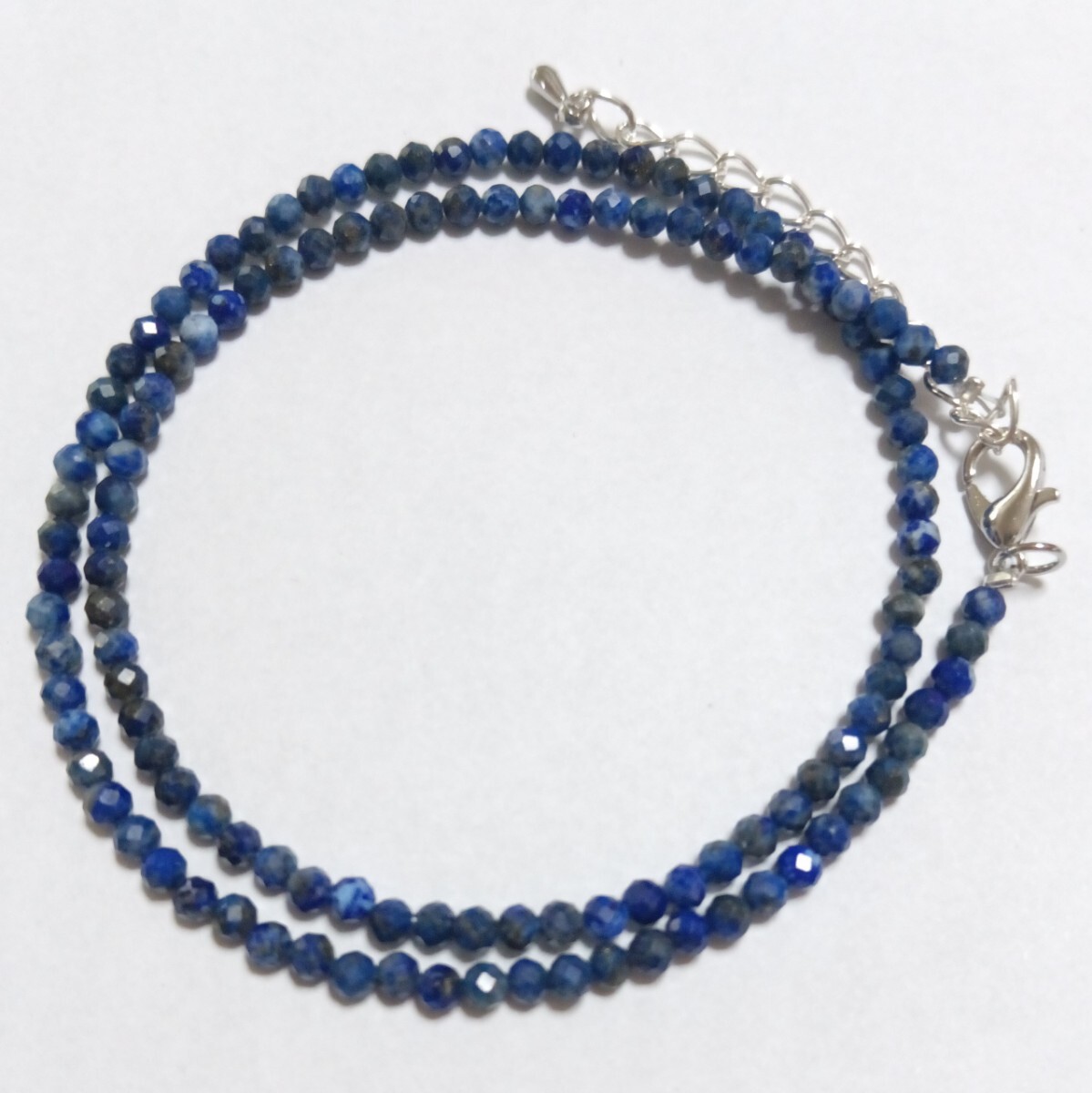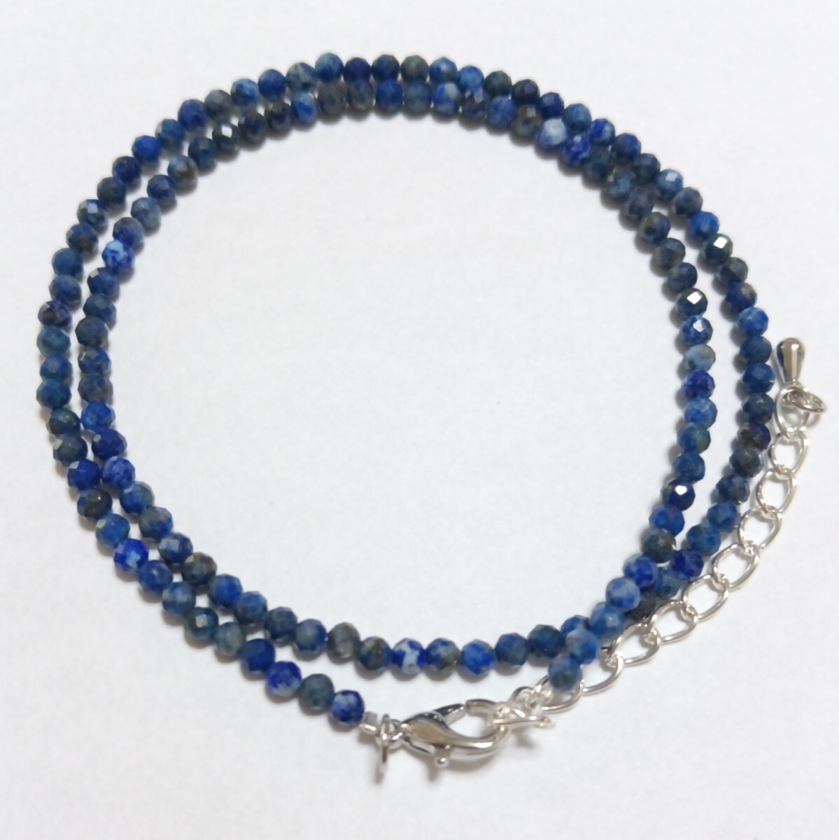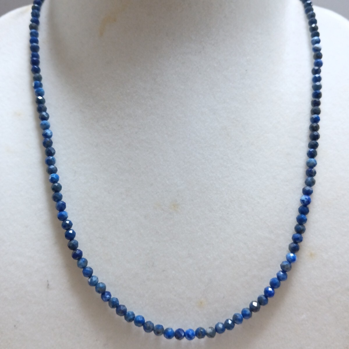 きれいなブルーカラー、ミラーカットの天然ラピスラズリのネックレスです。天然特有のまだら模様があります。