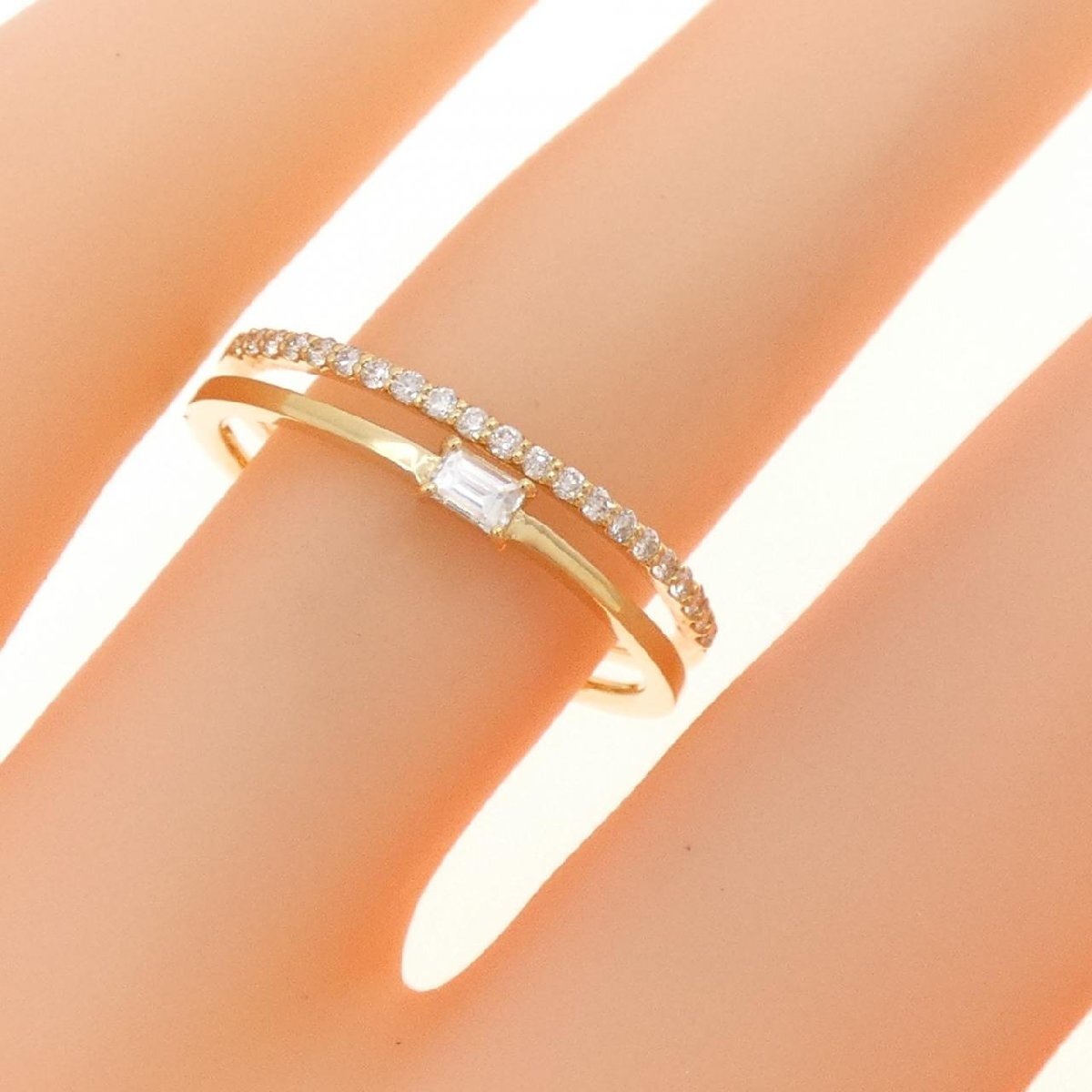 細かく輝くダイヤモンドがあしらわれたリング。華奢なデザインで、指元をスッキリと見せてくれます。