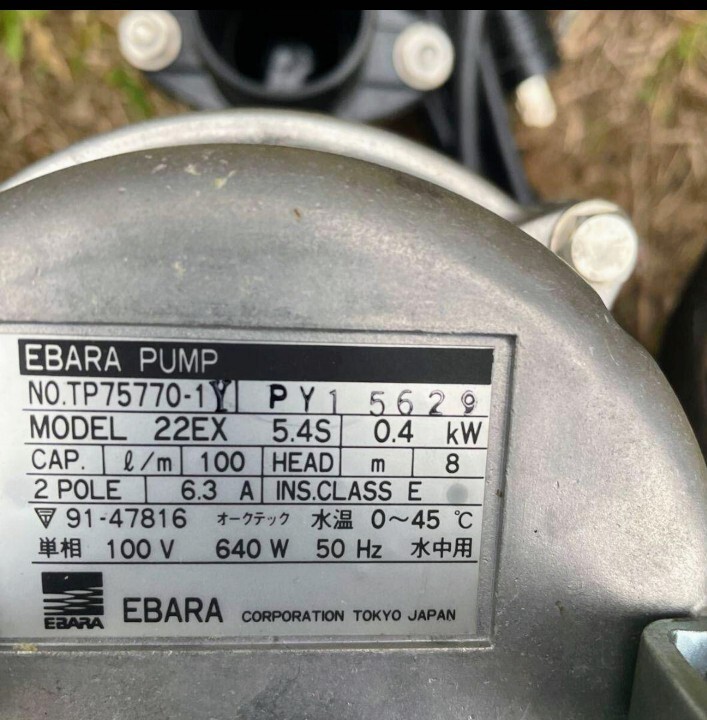 EBARA製の水中ポンプは、信頼性の高い性能を提供します。最大揚程8m、容量100/hの仕様で、さまざまな用途に対応可能です。