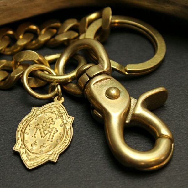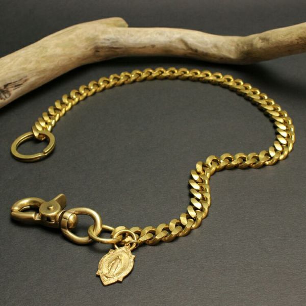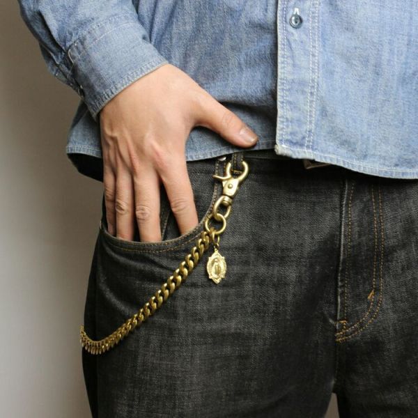 真鍮製喜平チェーンのウォレットチェーンとなります。 綺麗めなスタイルから無骨なアメカジ、バイカースタイルまで幅広い方にお勧めです。 チェーン部分は喜平のチェーンを採用し、インパクトある仕上がりに! フックをベルトループに付けて、2重リングに財布などに装着可能です。 喜平のチェーンは、太すぎと思われがちですが、着用するとスマートにいつものスタイルにハマります。 ■サイズ 全長:54cm チェーン:45cm メダイサイズ:H:2.7cmW:1.8cm ■注意事項 ・モニターの関係により実際の商品と色味が異なる場合がございますので予めご了承ください。 ・サイズに関しては制作の段階で多少の誤差が生じる場合がございますので、予めご了承ください。 ・真鍮製の為、使用していくと独特のくすみが生まれて来ます。 ・真鍮製品の素材の性質上、初めから細かな傷が付いている場合もございますので予めご了承ください。 ・新品未使用品ですが、製品の性質上細かな傷が生じている場合がございますので予めご遠慮ください。