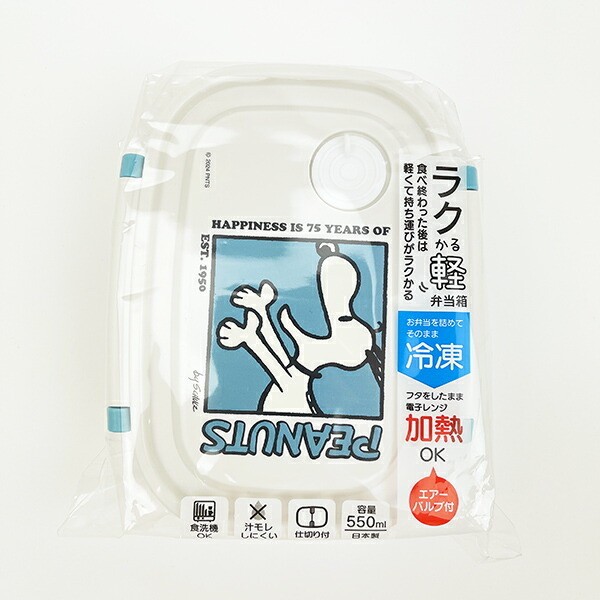 | 商品説明 | 75周年デザインのスヌーピーのお弁当箱です♪食べ終わった後は軽くて持ち運びがらくらく♪お弁当を詰めてそのまま冷凍もでき、フタをしたまま電子レンジ加熱OK♪汁漏れしにくいパッキン付きフタ。詰めやすい仕切り板付き。シンプル設計なので食品保存容器としても便利◎食洗機・電子レンジ使用可◎【容量:約550ml】 |