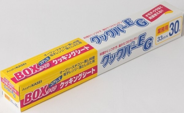 長年親しまれてきたクッキングシートの草分け的存在クックパーの姉妹品として新たに上市されたクックパーEG(ユーロ・グレード)は、旧来のクックパーと比較して油分の多い食材に対しての性能は若干落ちるものの、その他の基本的性能は変わることなく、油分が少な目の調理に、また落としぶた用として最適のクッキングシートであり、巻きの長さは1.5倍で1巻の価格は更に安くなっています。