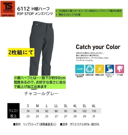 ビックイナバ特価◆TSDESIGN 6112H裾ハーフ RIP STOPメンズパンツ【25チャコールグレー・3Lサイズ】定価1枚7480円の品、2枚組で即決2980円