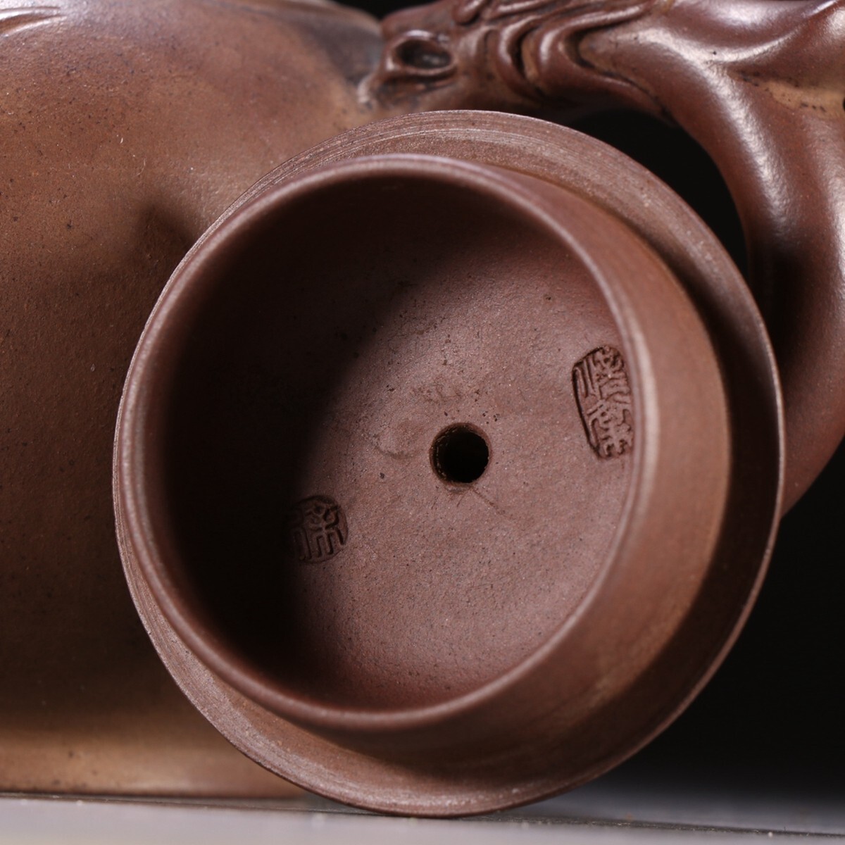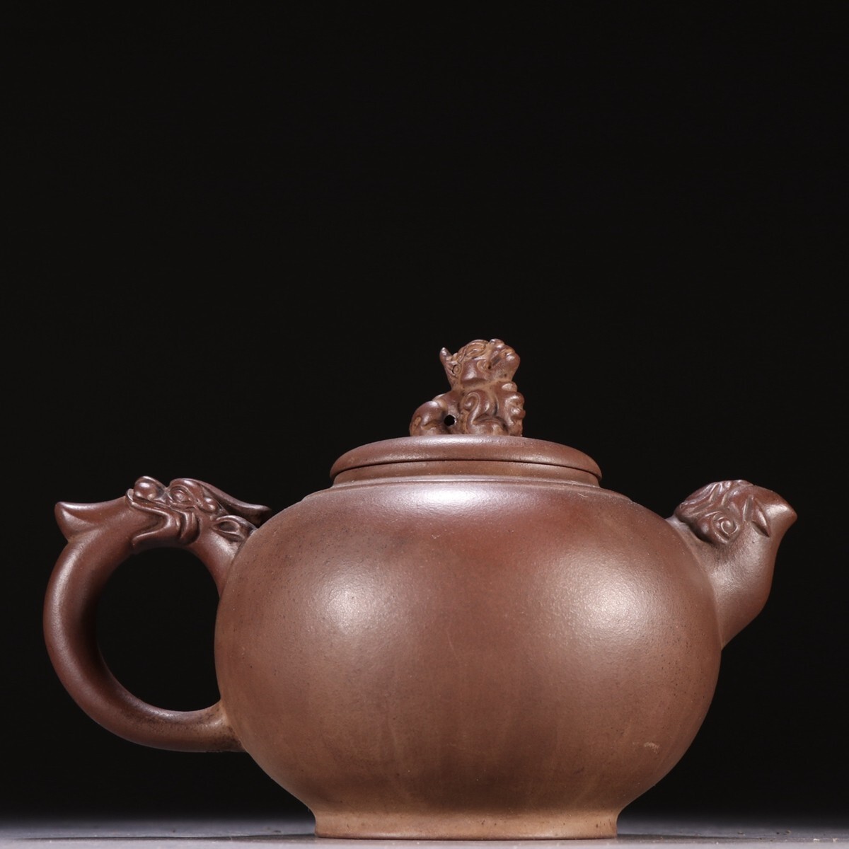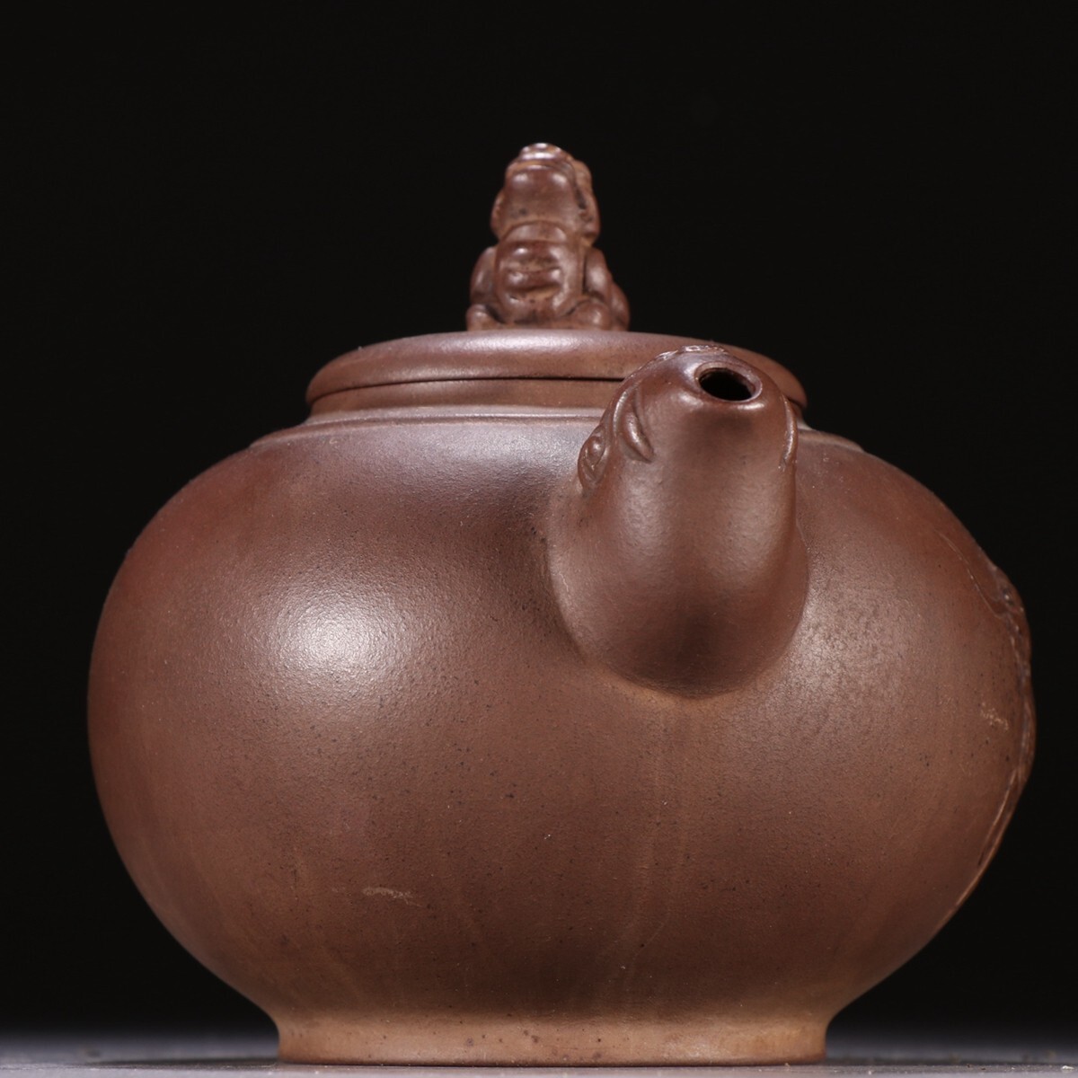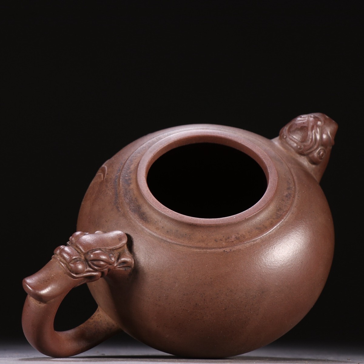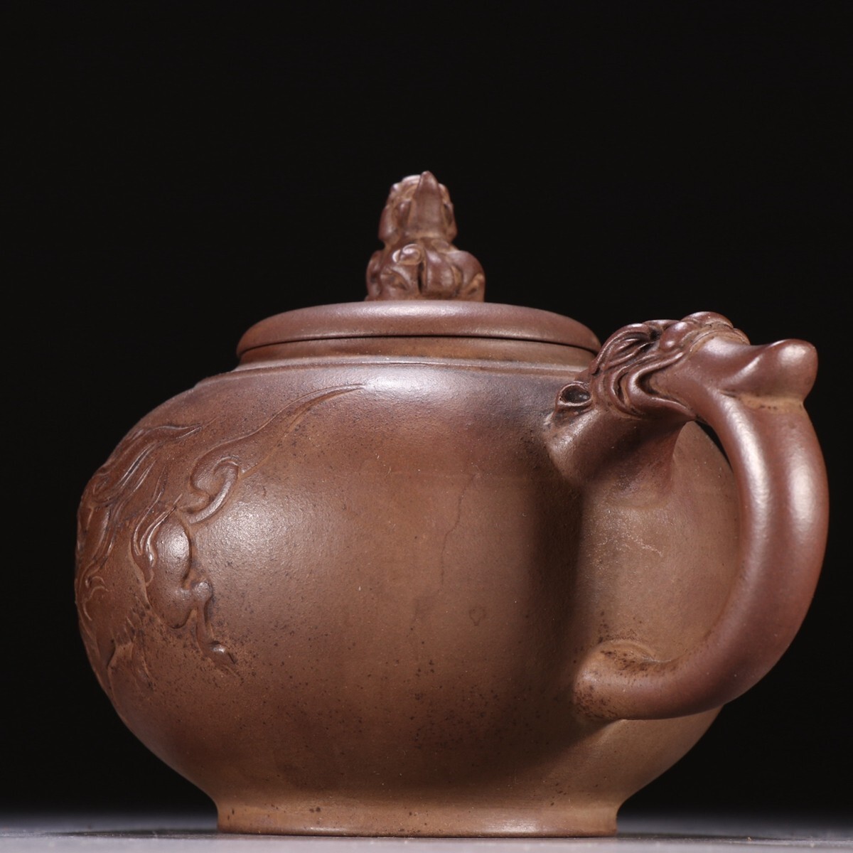 【瓏】紫砂彫 麒麟茶壺 徐漢棠製銘 近時代 中国陶磁器 陶芸 後手急須 茶壷 茶道具 置物 古美術 蔵出