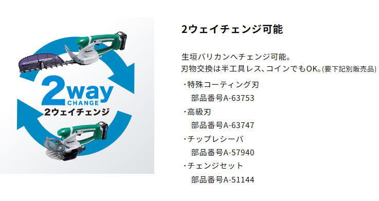 生垣バリカンへチェンジ可能。刃物交換は半工具レス、コインでもOK。(要 下記別販売品)