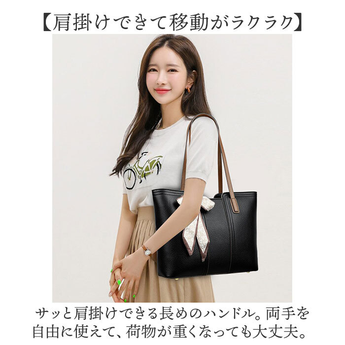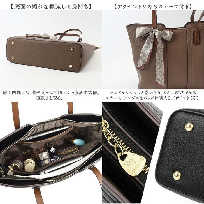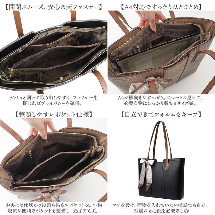 商品説明 | ・・【オン・オフ問わず頼れる相棒】 ・普段のお出かけも、通勤・通学もお任せ♪スタイリッシュな「レディース バッグ」。 ・【落ち着きのある上品な仕上がり】 ・しっとりとした肌触りで、シボ感のある本革を使用。使うほどに味わいが増すアイテム。 ・【肩掛けできて移動がラクラク】 ・サッと肩掛けできる長めのハンドル。両手を自由に使えて、荷物が重くなっても大丈夫。 ・【開閉スムーズ、安心の天ファスナー】 ・ガバっと開いて取り出しやすく、ファスナーを閉じればプライバシーを確保。 ・【A4対応ですっきりひとまとめ】 ・A4が横向きにすっぽり。スマートに見えて、必要な物はしっかり収まるサイズ感。 ・【整頓しやすいポケット仕様】 ・中央には仕切りの役割も果たすポケットを。小物収納に便利なポケットも装備し、迷子知らず。 ・【自立できてフォルムもキープ】 ・マチを設け、荷物を入れていない状態でも自立。型崩れも心配も必要なし◎ ・【底面の擦れを軽減して長持ち】 ・底面四隅には、傷や汚れが付きにくい底鋲を装備。直置きも安心。 ・【アクセントになるスカーフ付き】 ・ハンドルにサクッと巻いたり、リボン結びできるスカーフ。シンプルなバッグに映えるデザイン♪ ・(※)生産時期によりスカーフのデザインが異なります。 ・【ポケット仕様】 ・内側:ファスナー式仕切りポケット×1、ファスナーポケット×1、オープンポケット×1 |