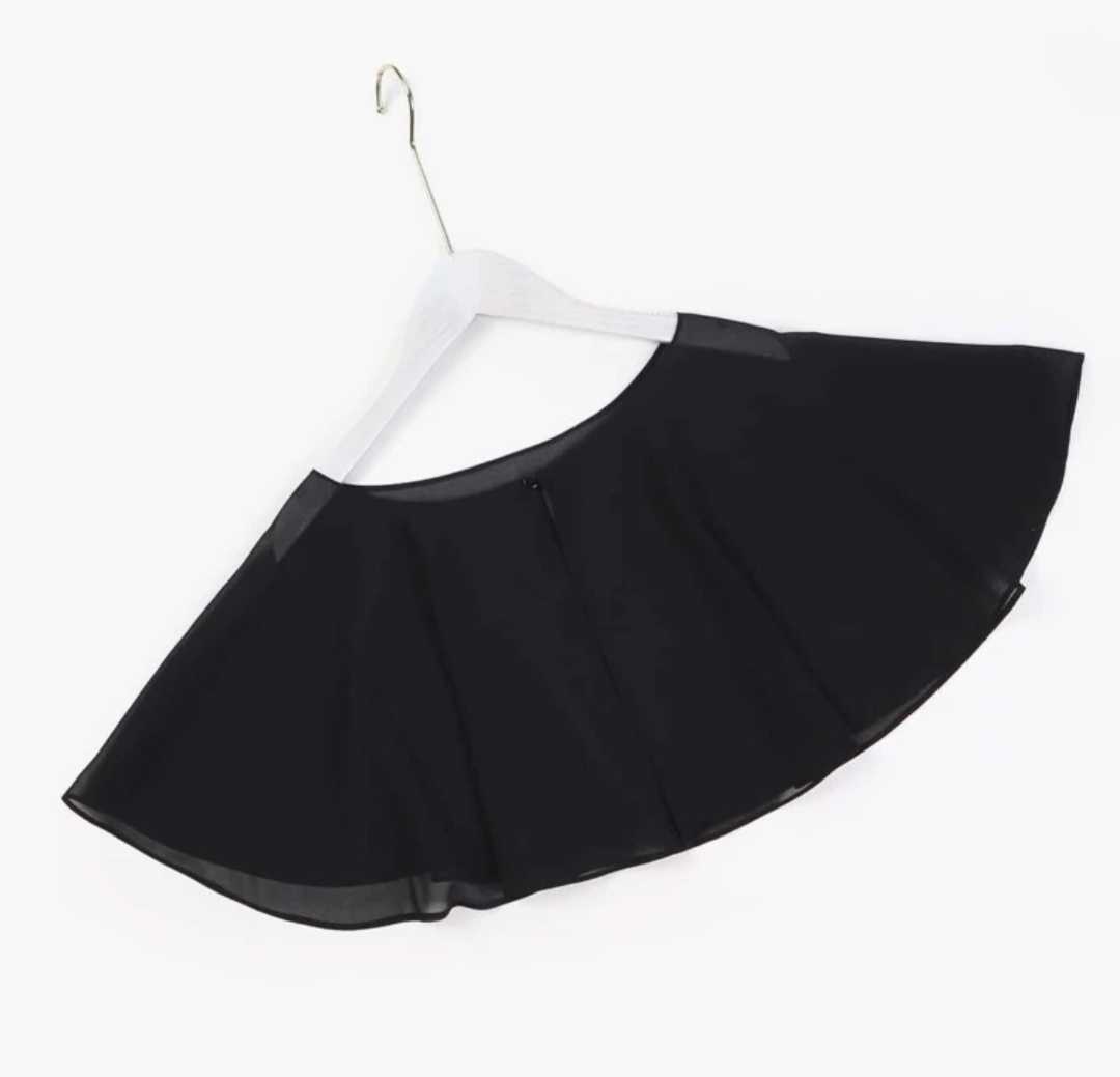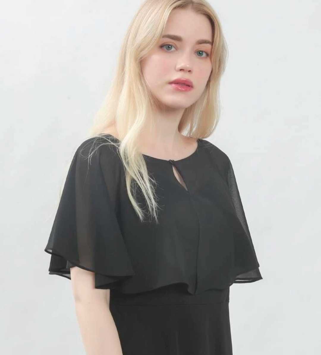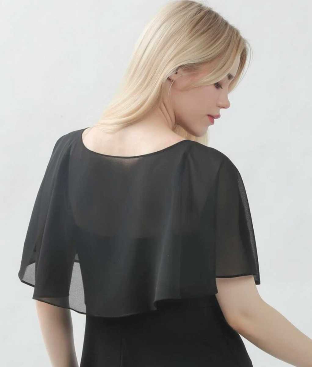 フロントボタン1つ留めのシンプルなシフォンケープで、どんなドレスにも合わせやすく、1枚あると便利です!