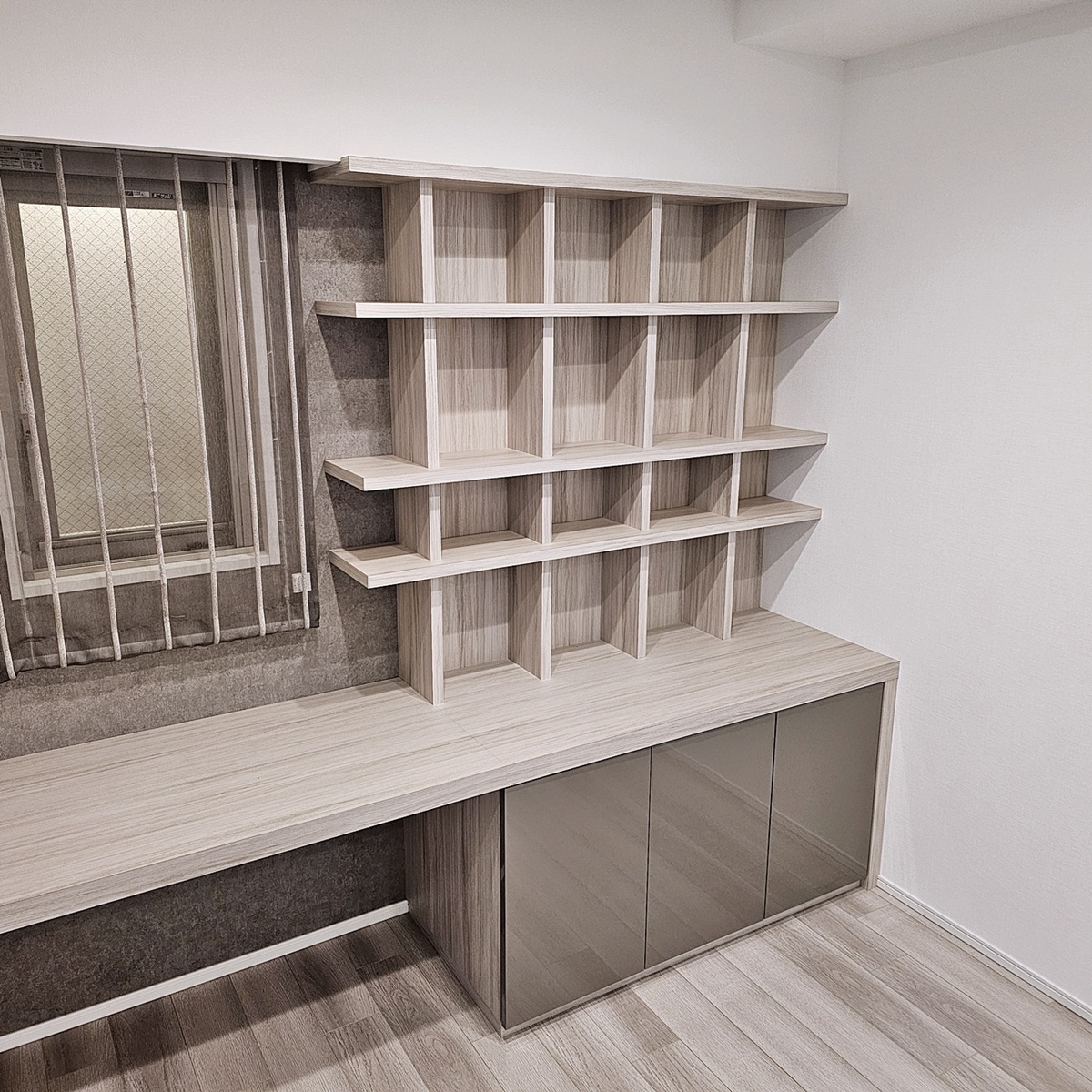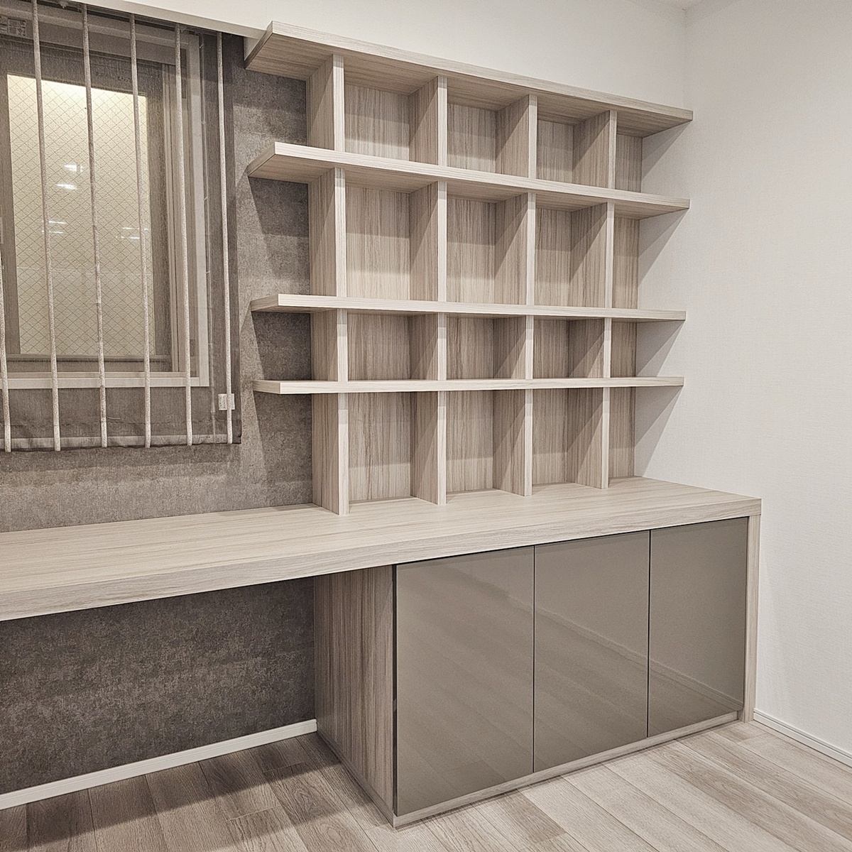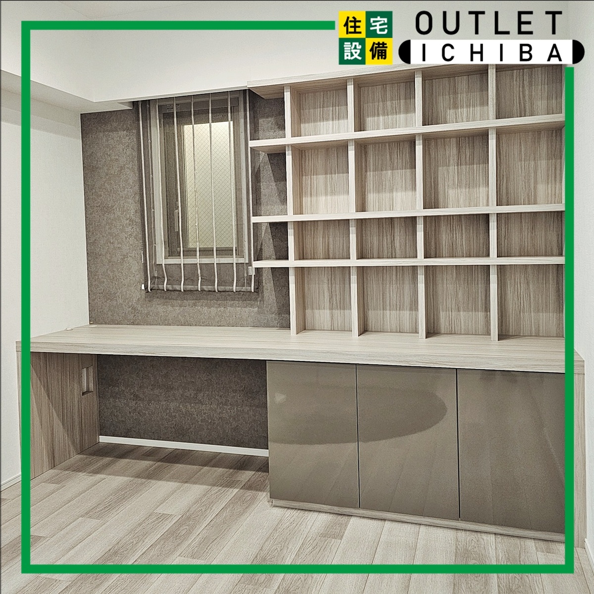 JTK17 モデルルーム展示品 造作リビングボード サイドボード 簡易デスク 戸棚 ウォールシェルフ 壁面棚 格子型 ナチュラル