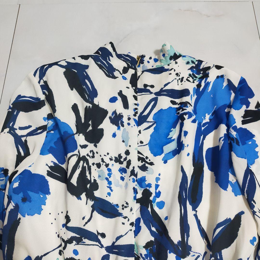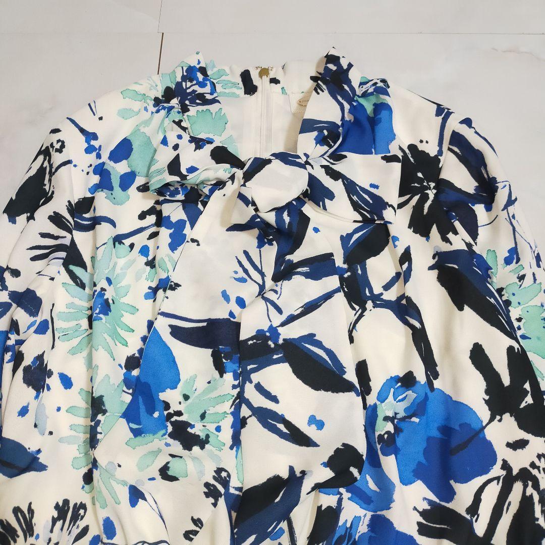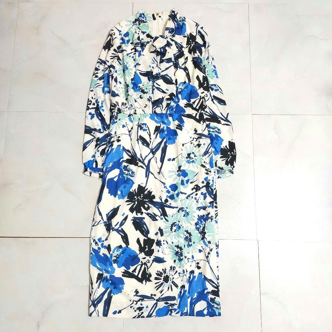 すっきりとしたタイトシルエットが女性らしさを演出し、襟元のリボンがクラシカルな印象を与えます。華奢なメタルバックルベルでスタイリングを引き締めた華やかワンピースです。