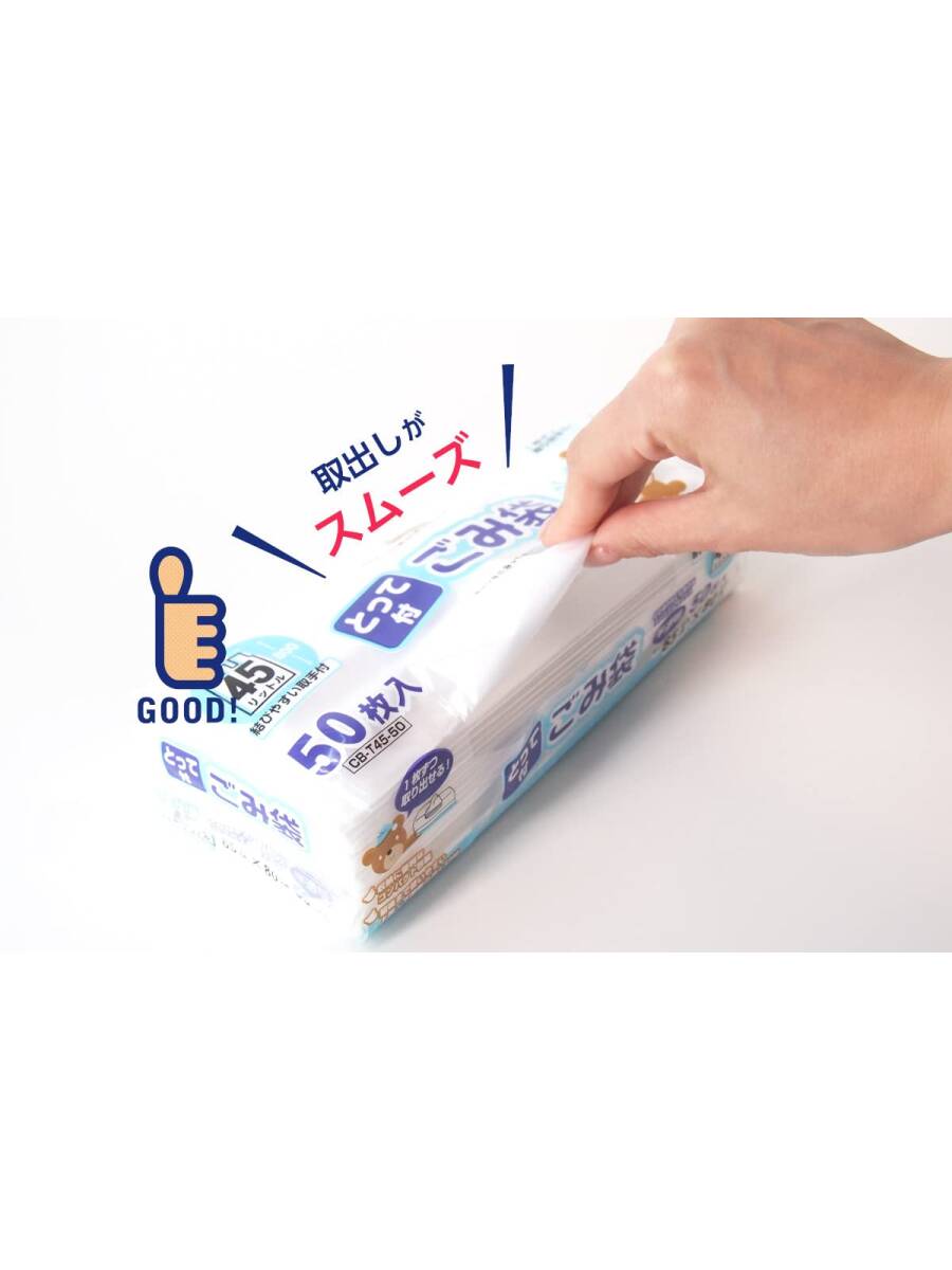 ●収納に便利なコンパクトなボックスタイプ。 ●45Lのゴミ袋です。 ●半透明色で中身が程よく見えます。 ●1枚ずつ手軽に取り出すことが可能です。 ●シャカシャカした手触りの高密度ポリエチレン製。 ●結びやすくするために取っ手がついています。