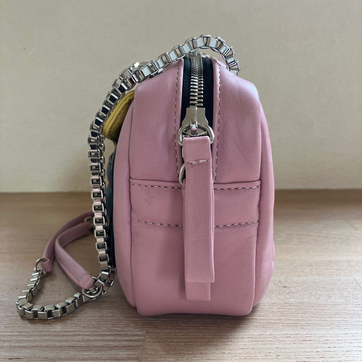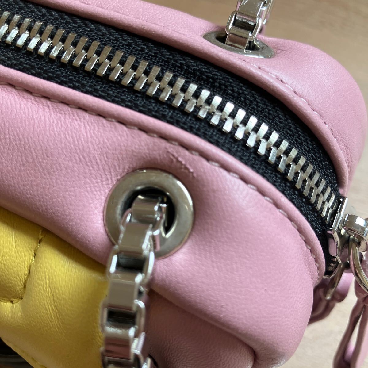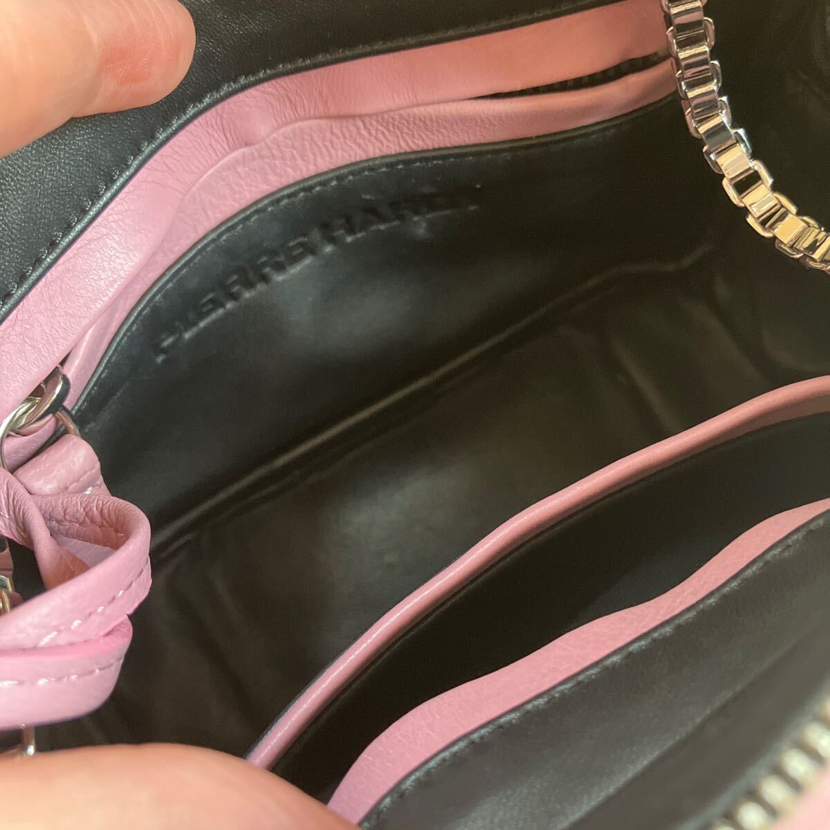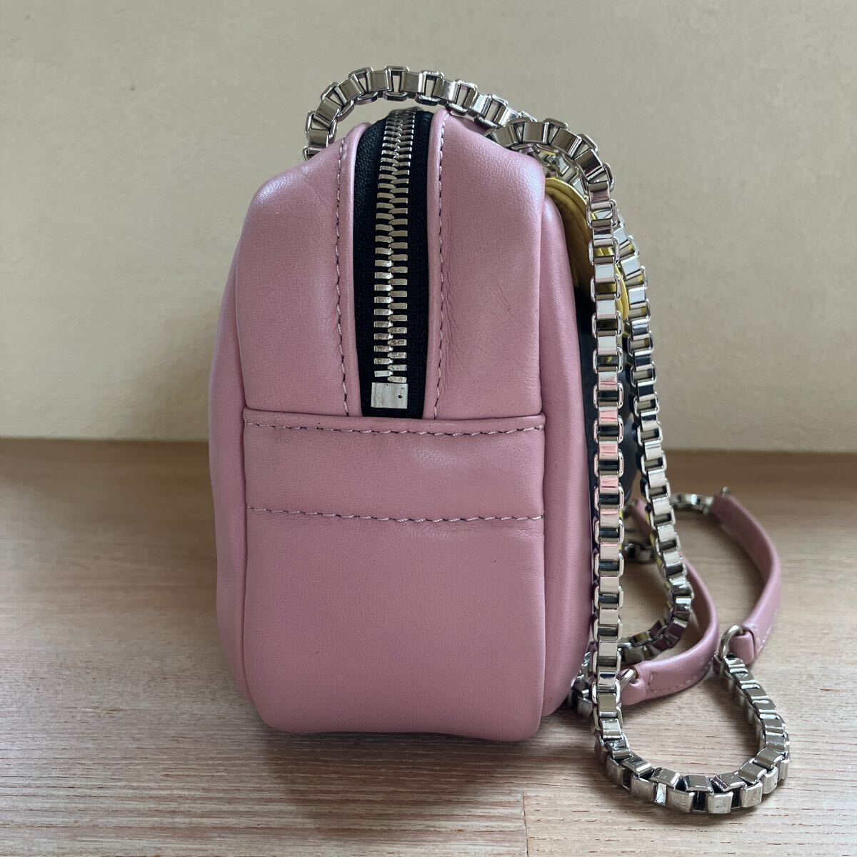 1番目立つものが画像7枚目ショルダーチェーンの付け根あたりに擦り傷です。またバッグ内側には汚れが数箇所あります。バッグ内にミラーはありません。