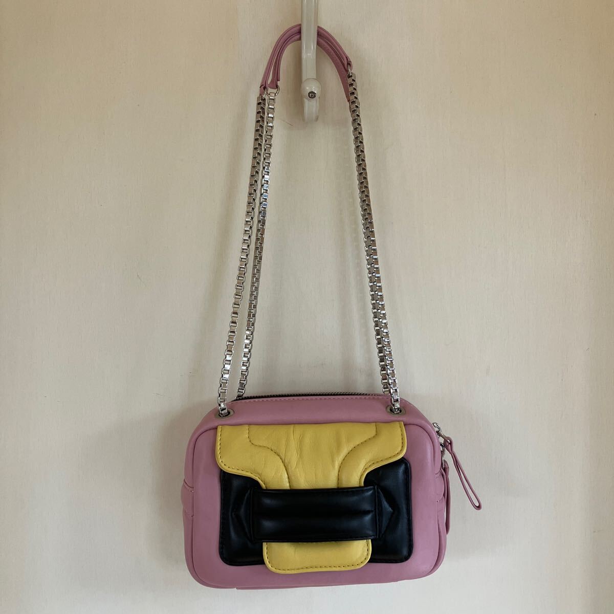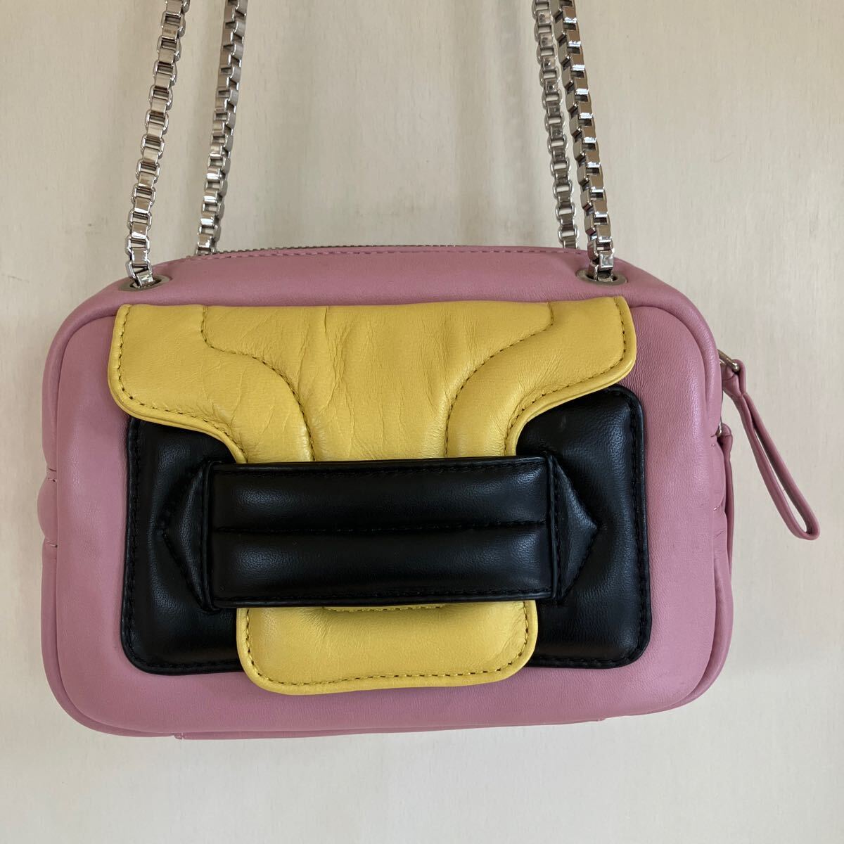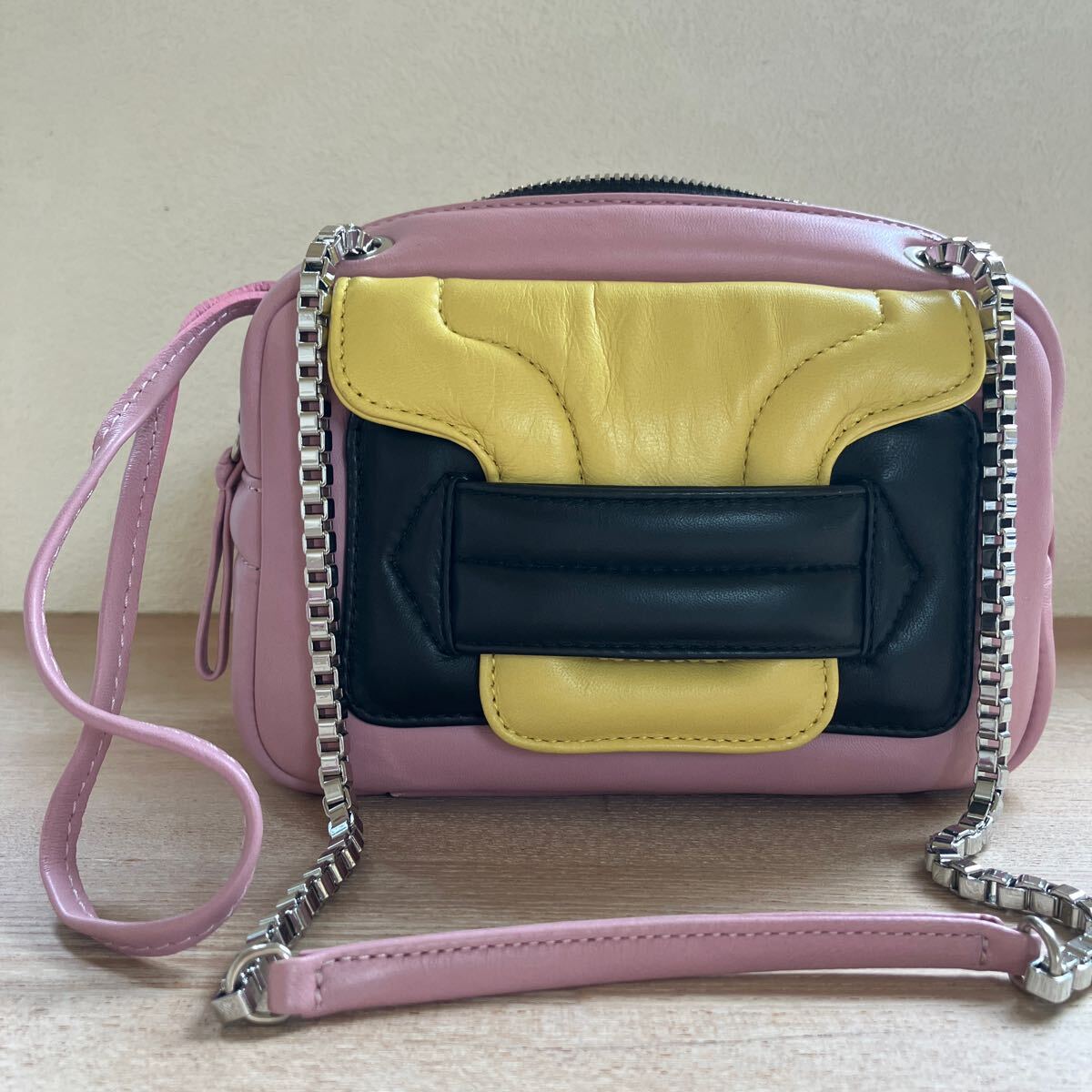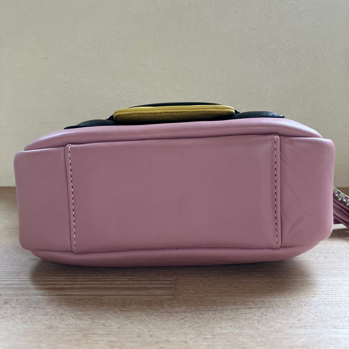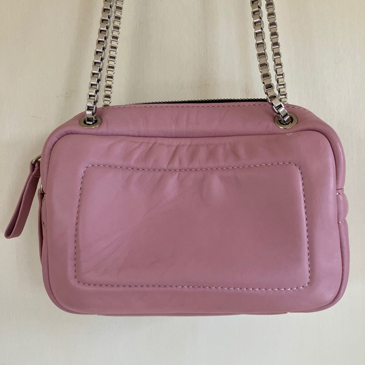 1番目立つものが画像7枚目ショルダーチェーンの付け根あたりに擦り傷です。またバッグ内側には汚れが数箇所あります。バッグ内にミラーはありません。
