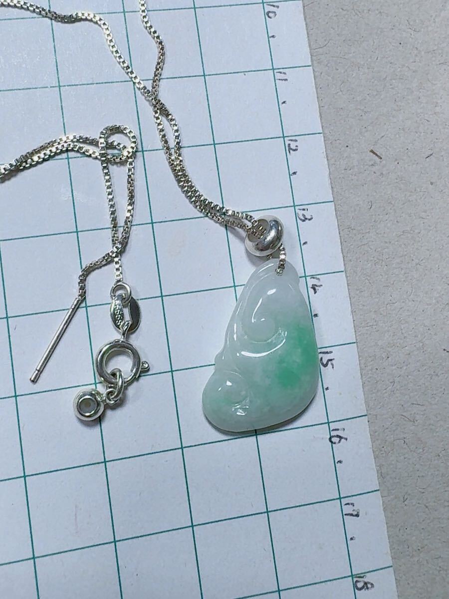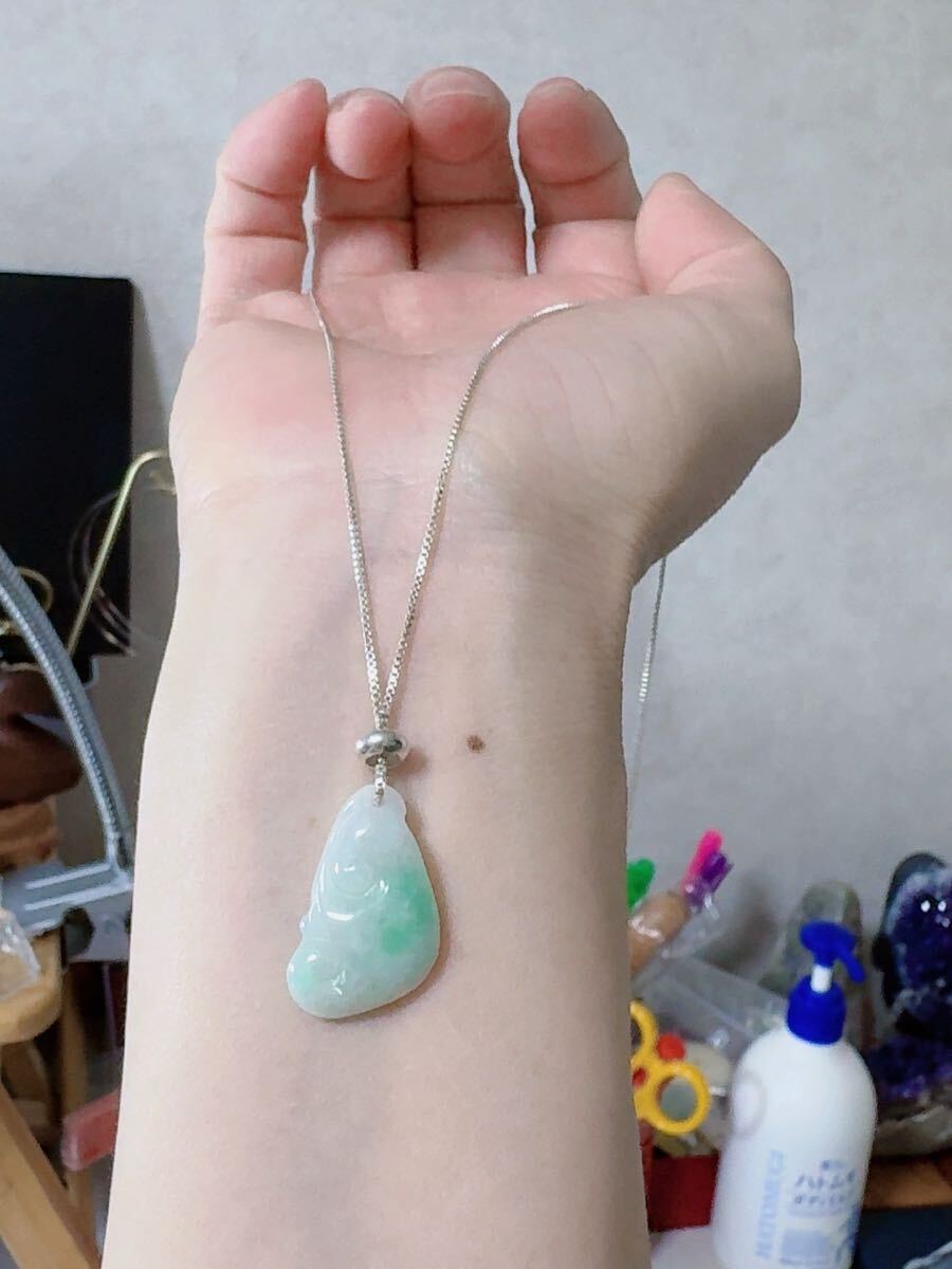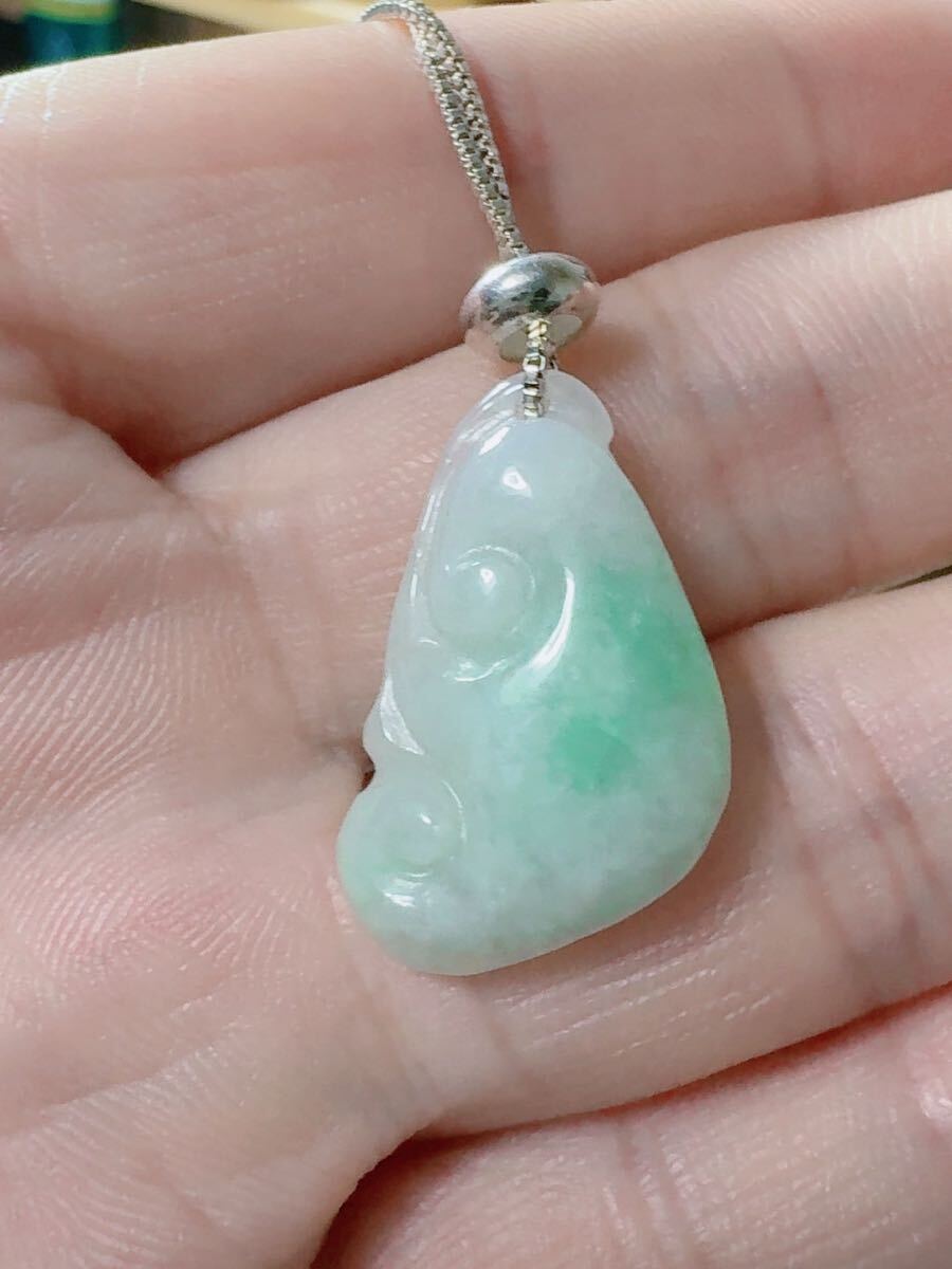 R2-01583天然石 《本物保証》陽春白雪一点緑翡翠 「如意」ペンダント ネックレスSV999約45cm(調整可能) パワーストーン 縁起物