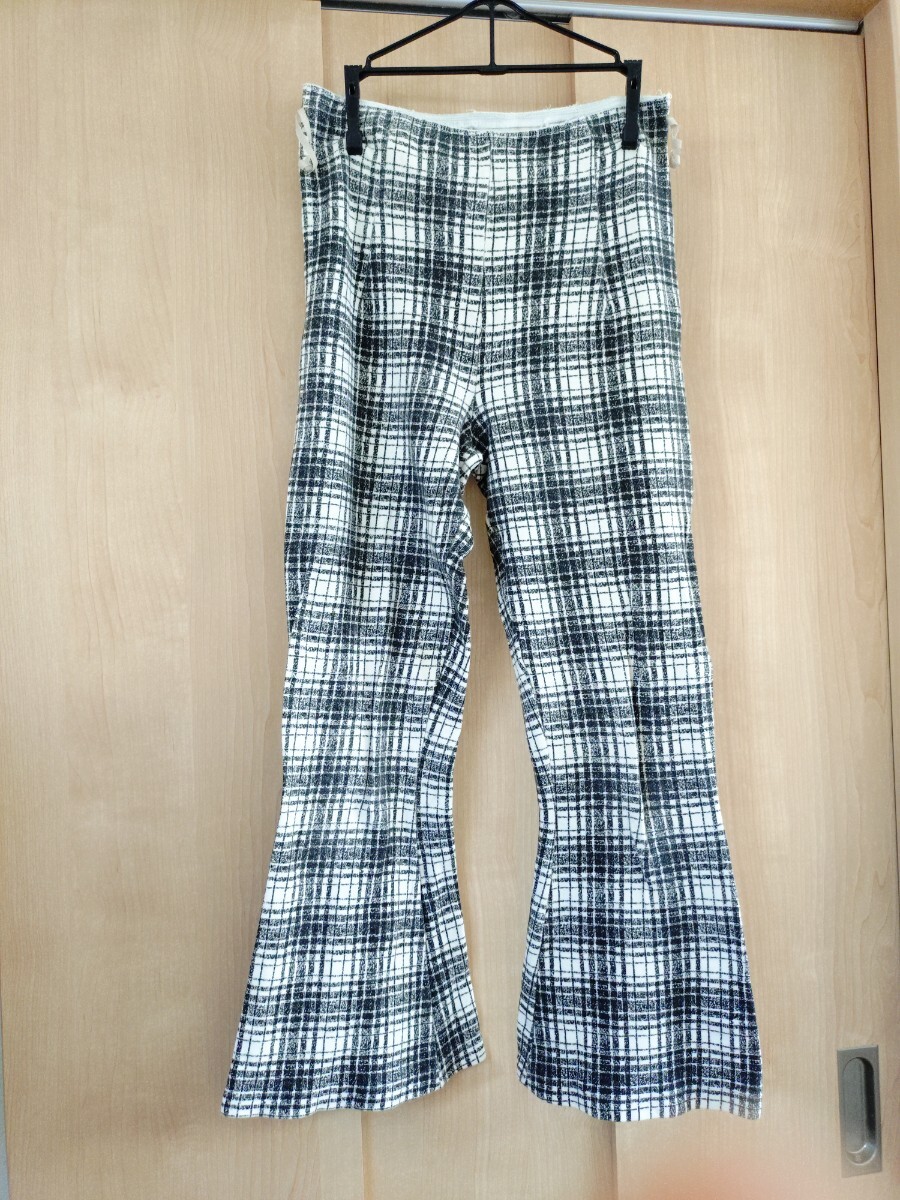 チェック柄の裾広がり ベルボトム 細身パンツです。