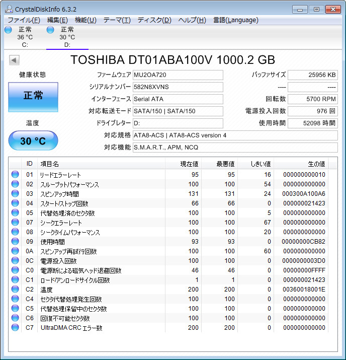 どちらにも不良セクタの表示は何もありません。動作は問題なく、良品と思います(^o^)