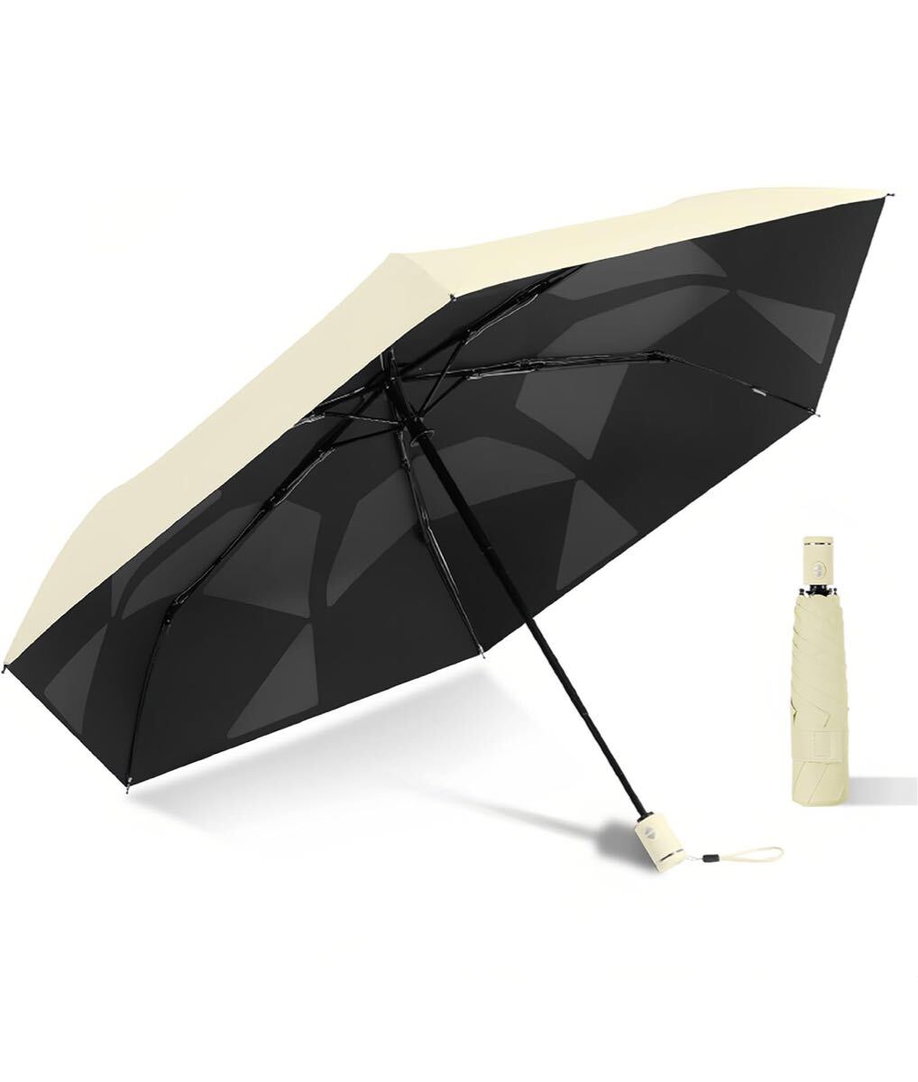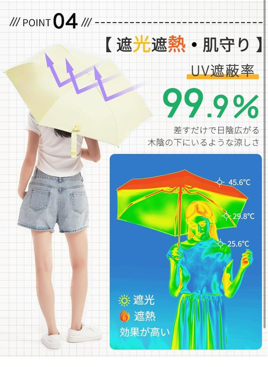 【紫外線対策・遮光遮熱】UPF50+の高い紫外線防止効果を誇り、99.9%の紫外線をシャットアウトします。高密度の傘布と日焼け止めの黒のポリウレタンコーティング加工を組み合わせた、日焼けを防ぐために必要なUVカットの性能を兼ね揃えた、紫外線対策にはピッタリのアイテムとなっています。これにより、真夏でも外出も涼しく快適に過ごせます。この折り畳み傘は夏の必需品で、日差しを気にせず、心地よい時間をお楽しみください!