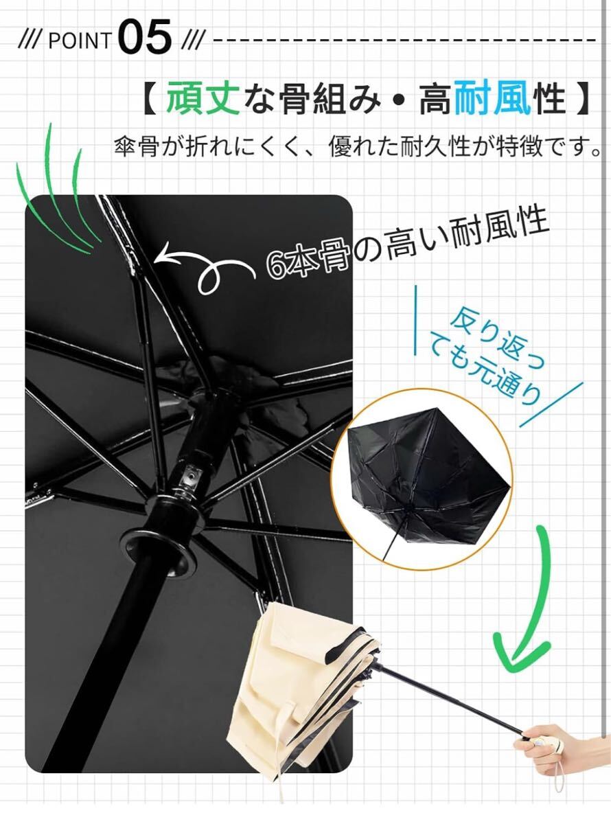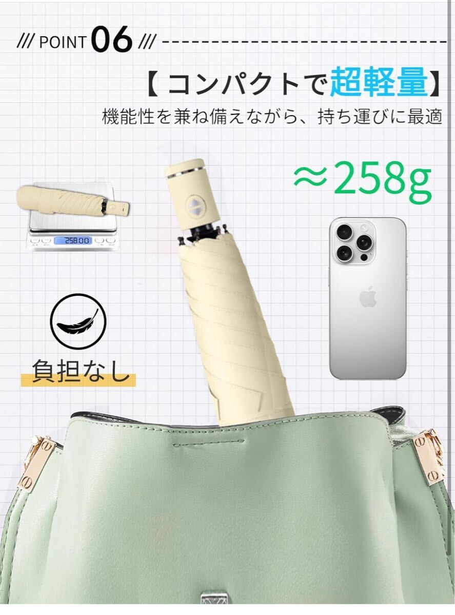 【軽量・コンパクト・携帯便利】折りたたみ日傘はアルミニウム合金とグラスファイバーの骨組みを採用し、屈曲性に富んで、軽量性・携帯性・頑丈さを一気に実現します。開いた状態で直径92cm、収納時は厚さがわずか25×5cmと超薄型で、ポケットにも収まるコンパクトなデザインです。重さは約258gと非常に軽量で、日常的な持ち運びに最適で、邪魔になりません。